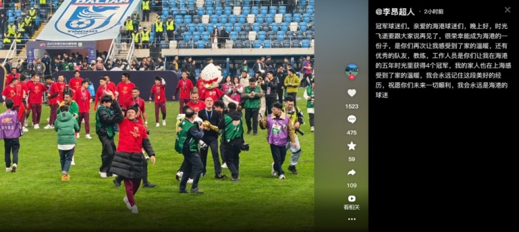 李昂在个人微博写道:冠军球迷们。亲爱的海港球迷们,晚上好,时光飞逝要跟大家说再见了,很荣幸能成为海港的一份子,是你们再次让我感受到了家的温暖,还有优秀的队友,教练,工作人员是你们让我在海港的五年时光里获得4个冠军,我的家人也在上海感受到了家的温暖,我会永远记住这段美好的经历,祝愿你们未来一切顺利,我会永远是海港的球迷。