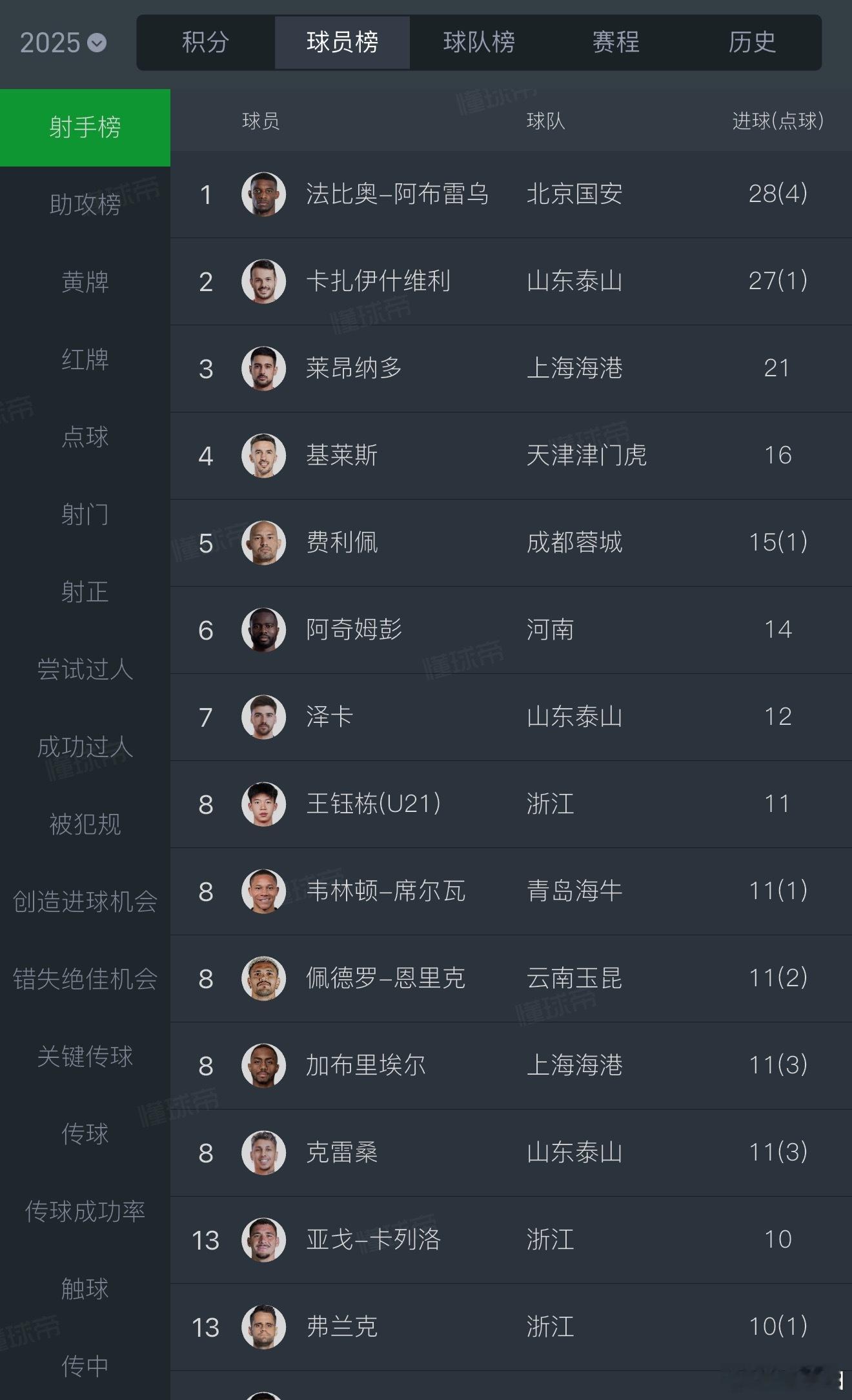 2025中超大结局(图一)。积分榜前7的排列(图二)和上赛季完全一样(图三)。梅州客家与长春亚泰降入中甲。辽宁铁人和重庆铜梁龙升入中超。中超冠军上海海港将直接获得2026到27赛季亚冠精英赛正赛参赛资格,国安与河南足协杯决赛的胜者将获得亚冠精英联赛附加赛(非直接参赛)名额,需通过附加赛争夺正赛资格。联赛亚军上海申花获得亚冠二级联赛正赛(直接参赛)名额。射手方面,国安外援法比奥最后一轮完成大四喜,以28个进球超越卡扎伊什维利成为金靴(图四)。