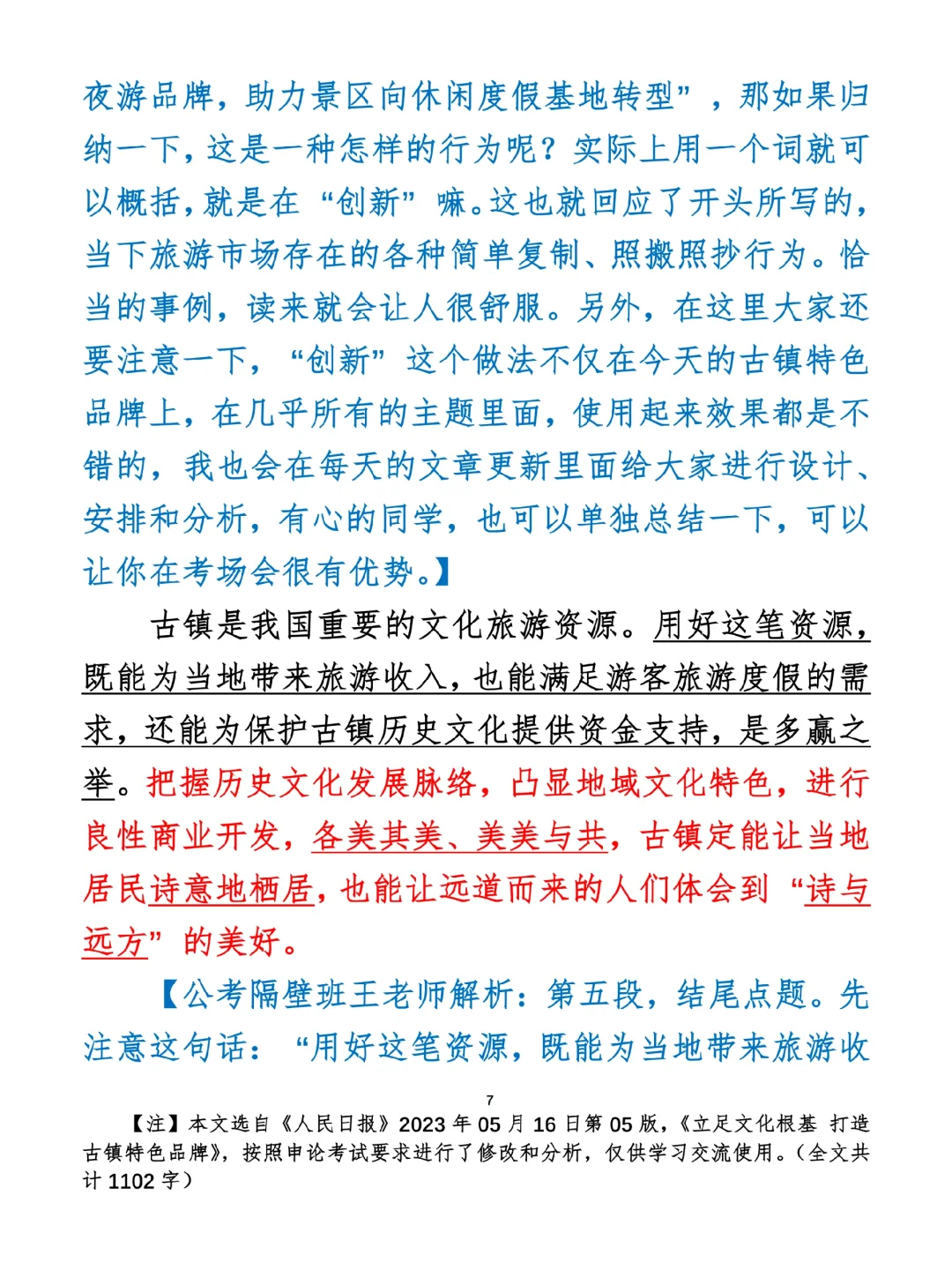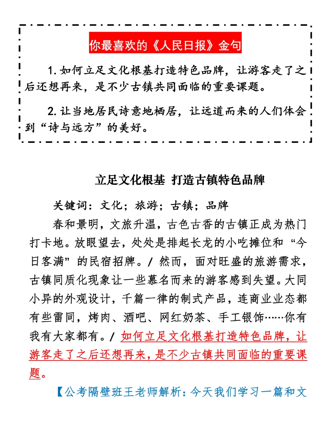 如何抄写:每日抄写文章发在“公考隔壁班王老师”账号,红色字是重点句和结构句,黑色字是正文,蓝色字是解析,大家抄写时不必抄蓝色字。建议先通读全文,做到心中有数再开始抄写,效果会更好。 关于文章:抄写文章来源于人民日报,但每篇文章我都根据申论考试要求进行了修改:一是重写或修改开头、结尾;二是统一段首句句式结构;三是调整段落字数,使文章结构更均衡;四是简化复杂长难句,使之更具可模仿性。每篇文章无论修改多少,都是基于申论考试要求,毫无对人民日报文章品评之意。(此处致敬人民日报)