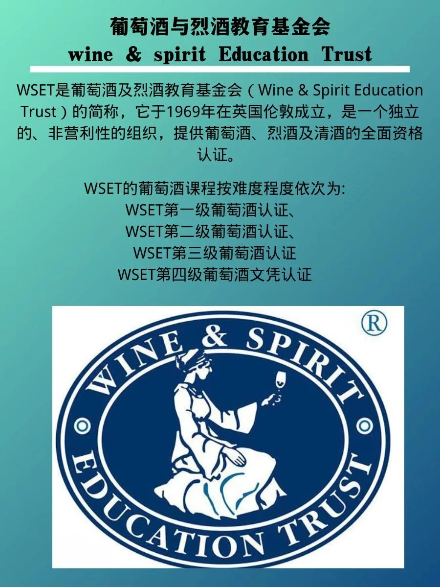 1⃣️WSET:WSET是葡萄酒及烈酒教育基金会(Wine & Spirit Education Trust)的简称,它于1969年在英国伦敦成立,是一个独立的、非营利性的组织,提供葡萄酒、烈酒及清酒的全面资格认证。