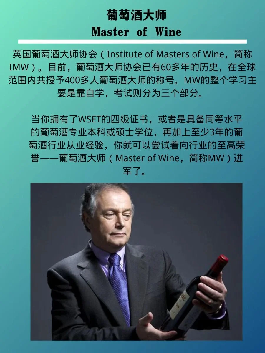 4⃣️IMW:英国葡萄酒大师协会(Institute of Masters of Wine,简称IMW)。目前,葡萄酒大师协会已有60多年的历史,在全球范围内共授予400多人葡萄酒大师的称号。MW的整个学习主要是靠自学,考试则分为三个部分。