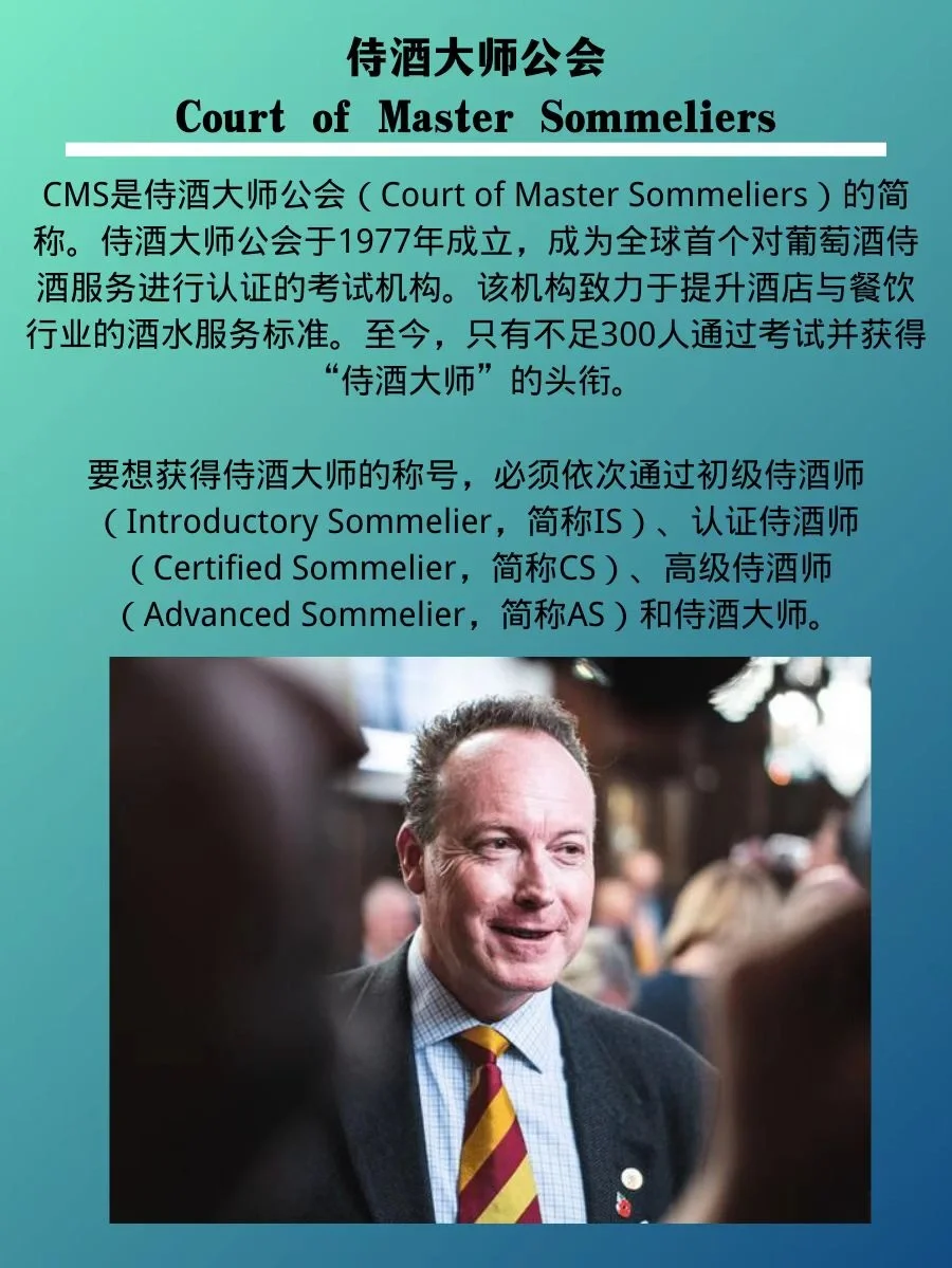 2⃣️CMS:是侍酒大师公会(Court of Master Sommeliers)的简称。1969年,首次侍酒大师(Master Sommelier)考试在英国伦敦举行,之后侍酒大师公会于1977年成立,成为全球首个对葡萄酒侍酒服务进行认证的考试机构。该机构致力于提升酒店与餐饮行业的酒水服务标准。