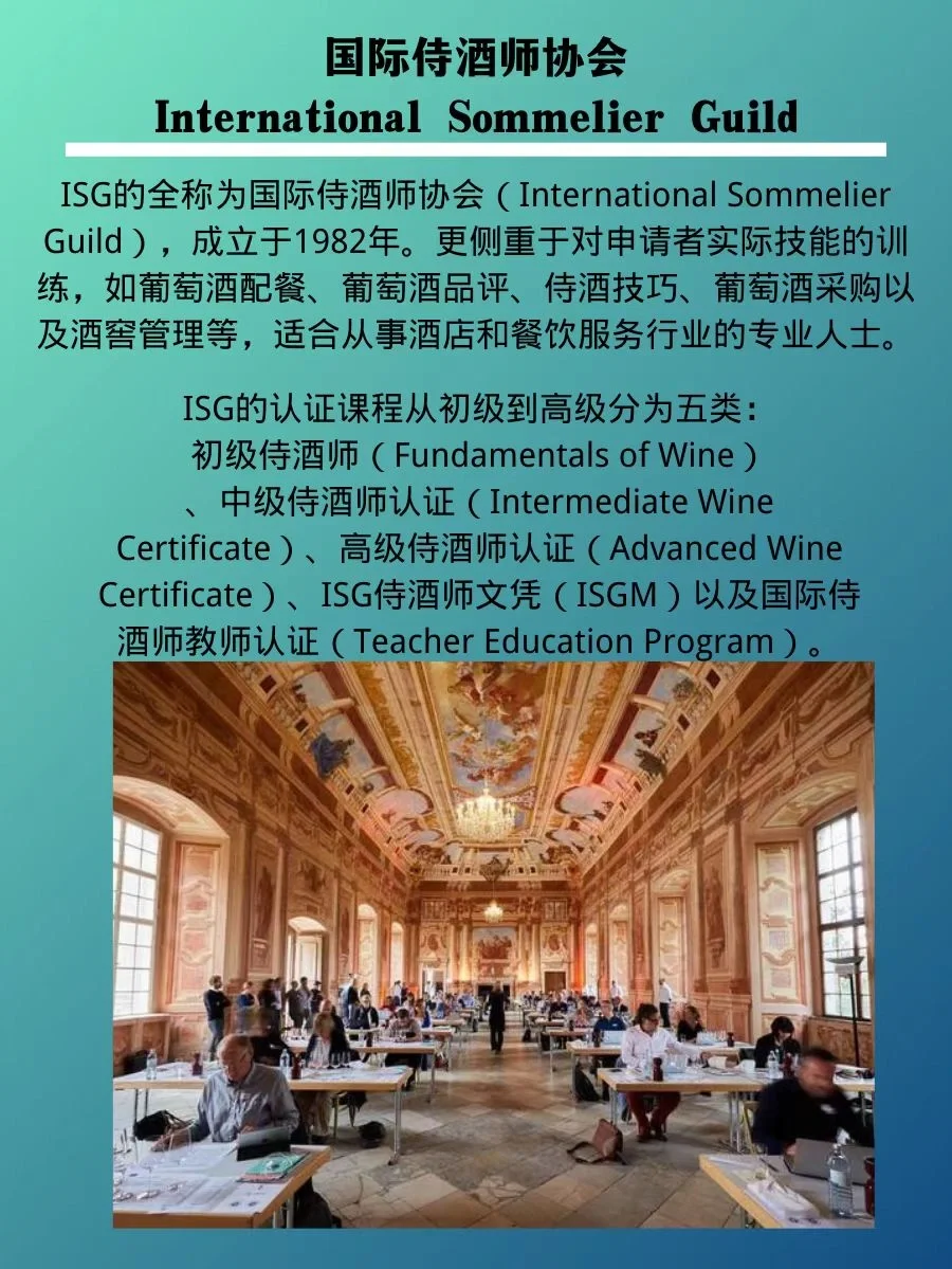 3⃣️ISG:ISG的全称为国际侍酒师协会(International Sommelier Guild),ISG更侧重于对申请者实际技能的训练,如葡萄酒配餐、葡萄酒品评、侍酒技巧、葡萄酒采购以及酒窖管理等,更适合从事酒店和餐饮服务行业的专业人士。