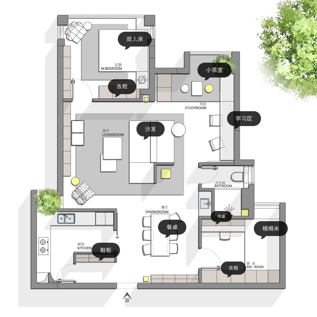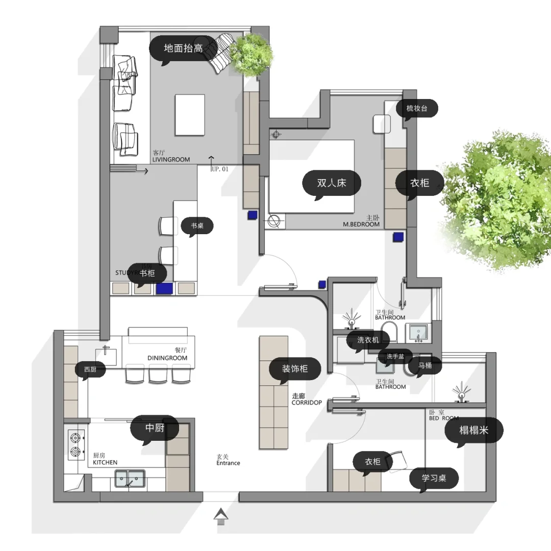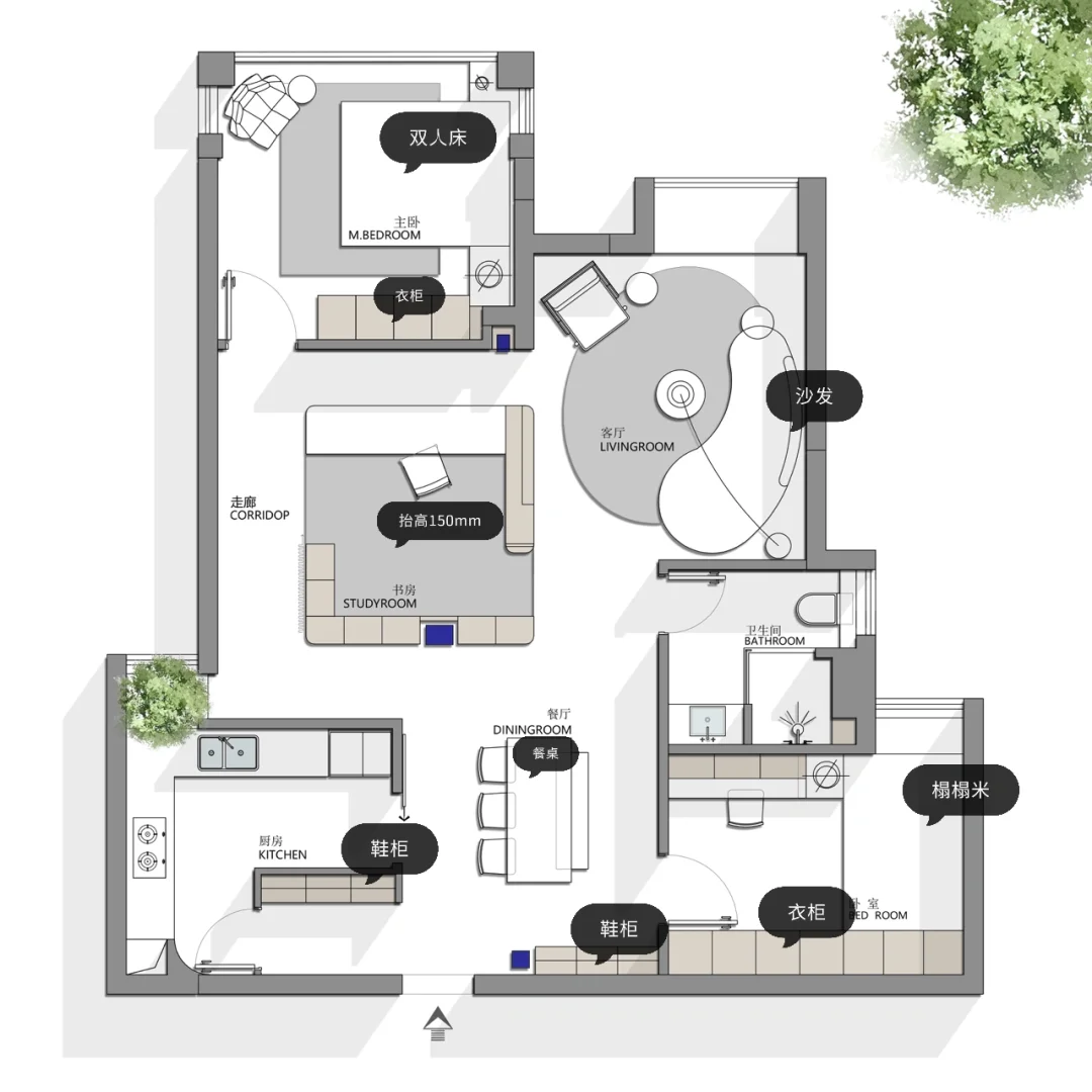 设计要求:一家三口,两个卧室,一个多功能书房,中西厨,客厅开阔大气,希望能看到不一样的空间,接受异形设计 设计风格:现代简约