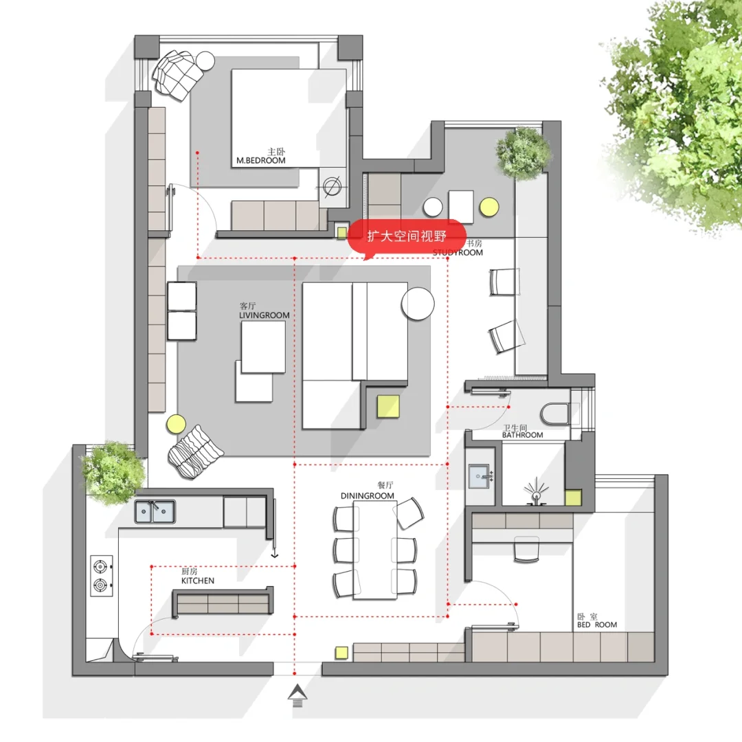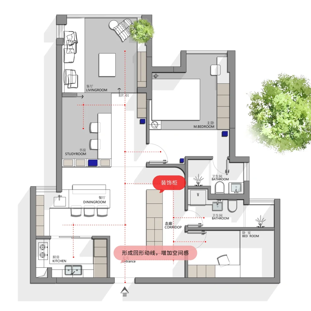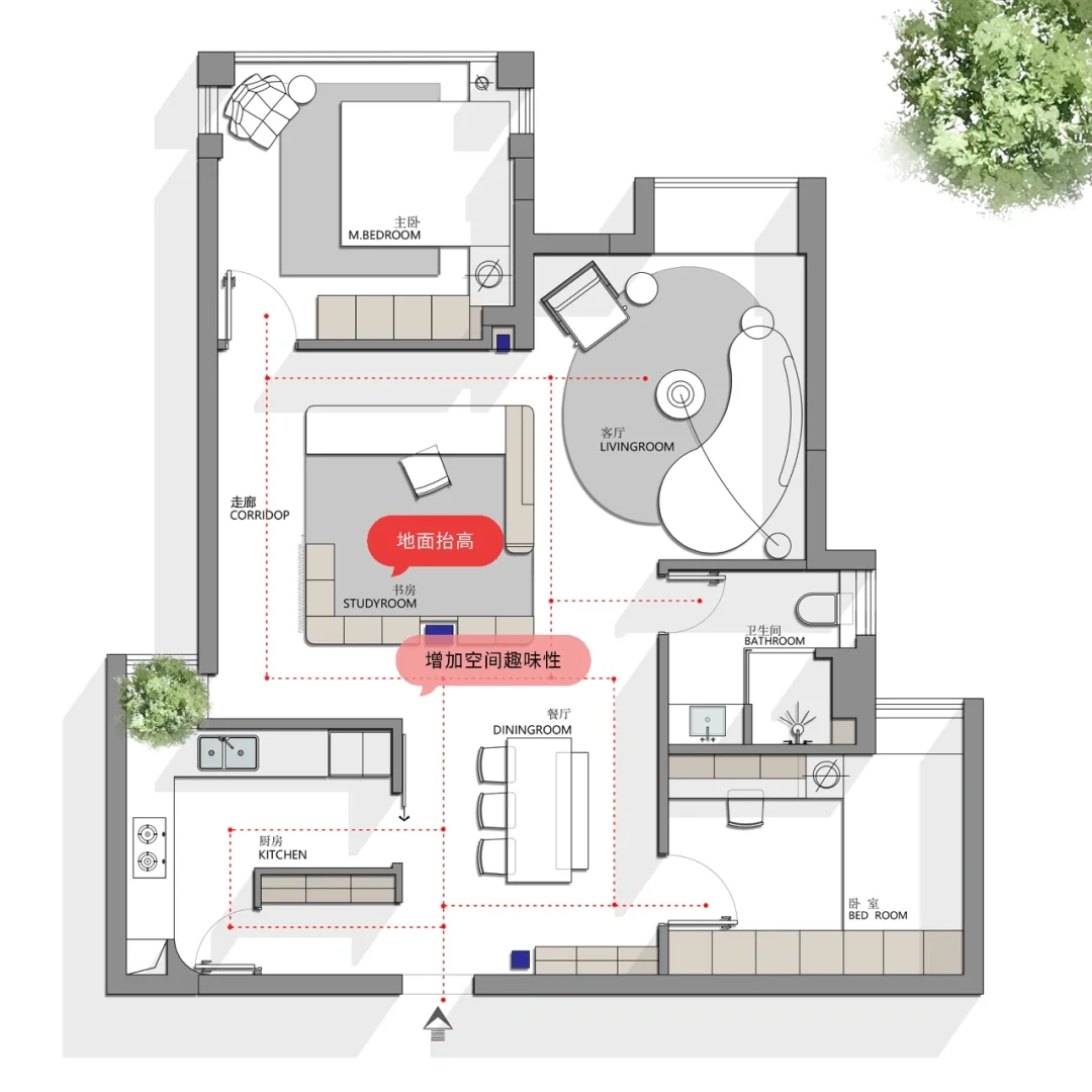 设计要求:一家三口,两个卧室,一个多功能书房,中西厨,客厅开阔大气,希望能看到不一样的空间,接受异形设计 设计风格:现代简约