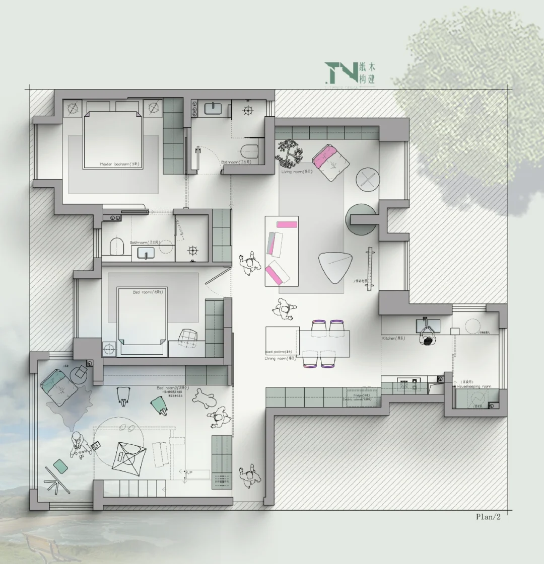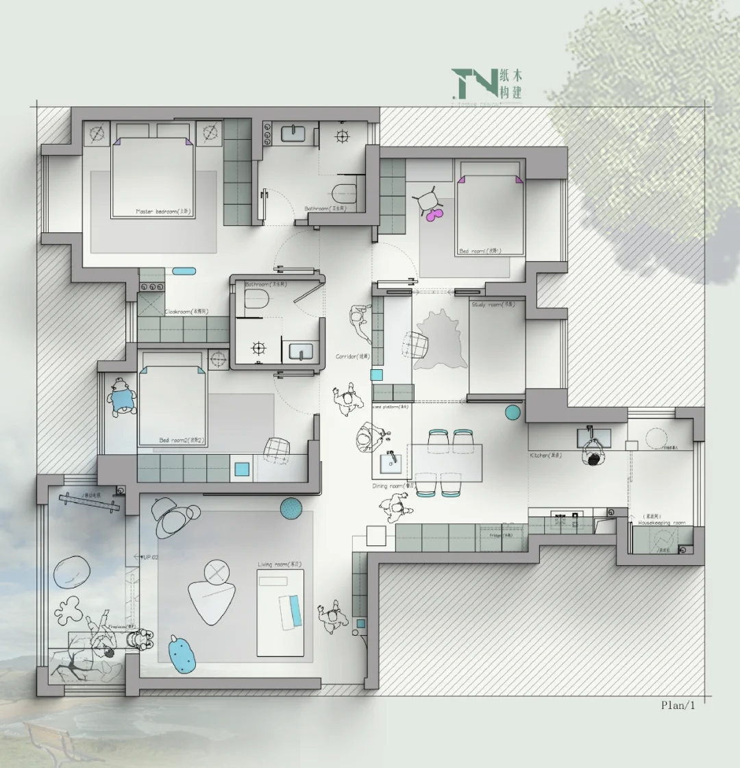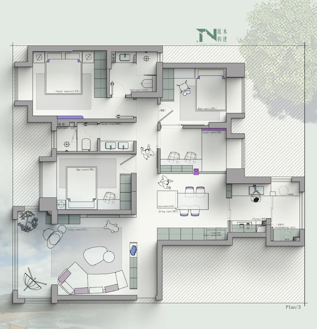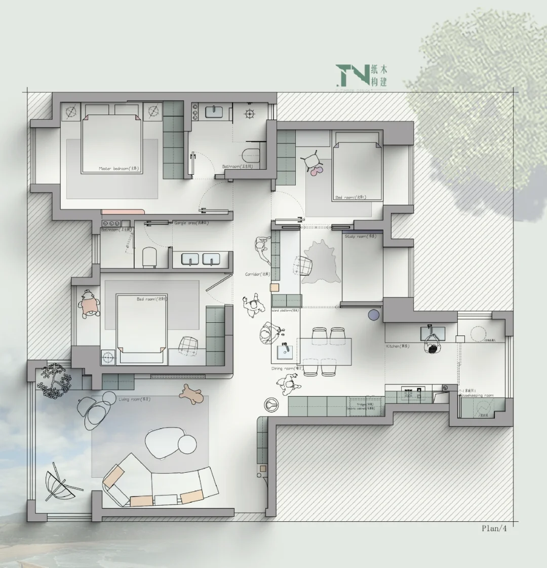 设计需求: 一家四口👨👩👧👦(一个6岁男孩,一个4岁女孩) 1、需要三个卧室,一个多功能书房 2、厨房可以开放式 3、餐厅太小,想要中岛 4、家政阳台 5、小孩小希望一个不一样的玩耍娱乐空间