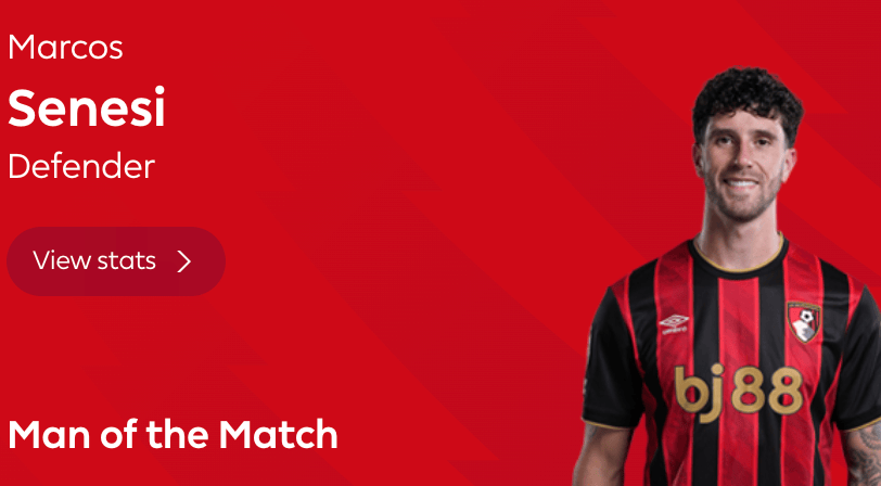 本场比赛伯恩茅斯中卫塞内西送出助攻,赛后,他当选了英超官方票选的全场最佳。