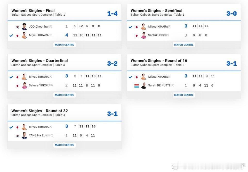 木原美悠获得2025WTT马斯喀特球星挑战赛女单冠军的夺冠之路🏆时隔3年再次获得WTT赛事冠军R32:3比1梁夏银🇰🇷(-7,6,4,11)R16:3比1德努特🇱🇺(6,4,-9,6)¼决赛:3比2横井咲樱🇯🇵(-3,-7,8,11,9)半决赛:3比0大藤沙月🇯🇵(6,6,8)决赛:4比1朱芊曦🇰🇷(6,-10,6,8,8)