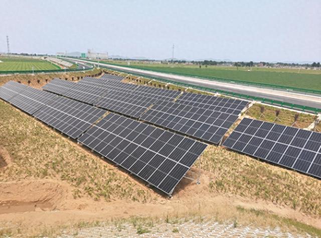 在秦唐高速公路一侧铺设的光伏电板。(图片由市交通运输局提供)