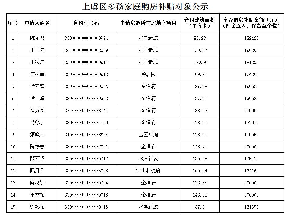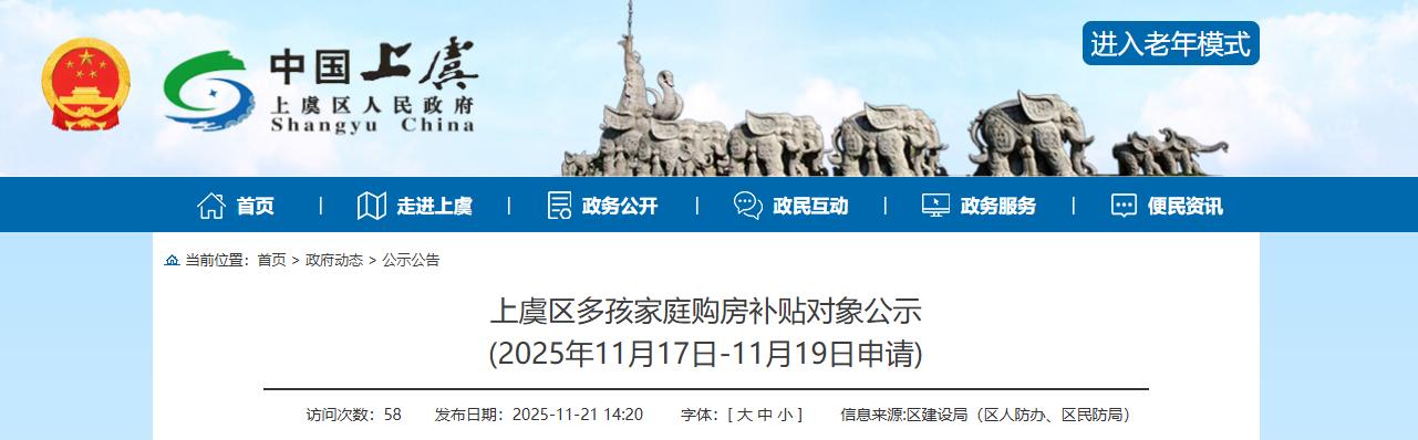 近日,绍兴上虞区人民政府发布一则《上虞区多孩家庭购房补贴对象公示(2025年11月17日-11月19日申请)》。