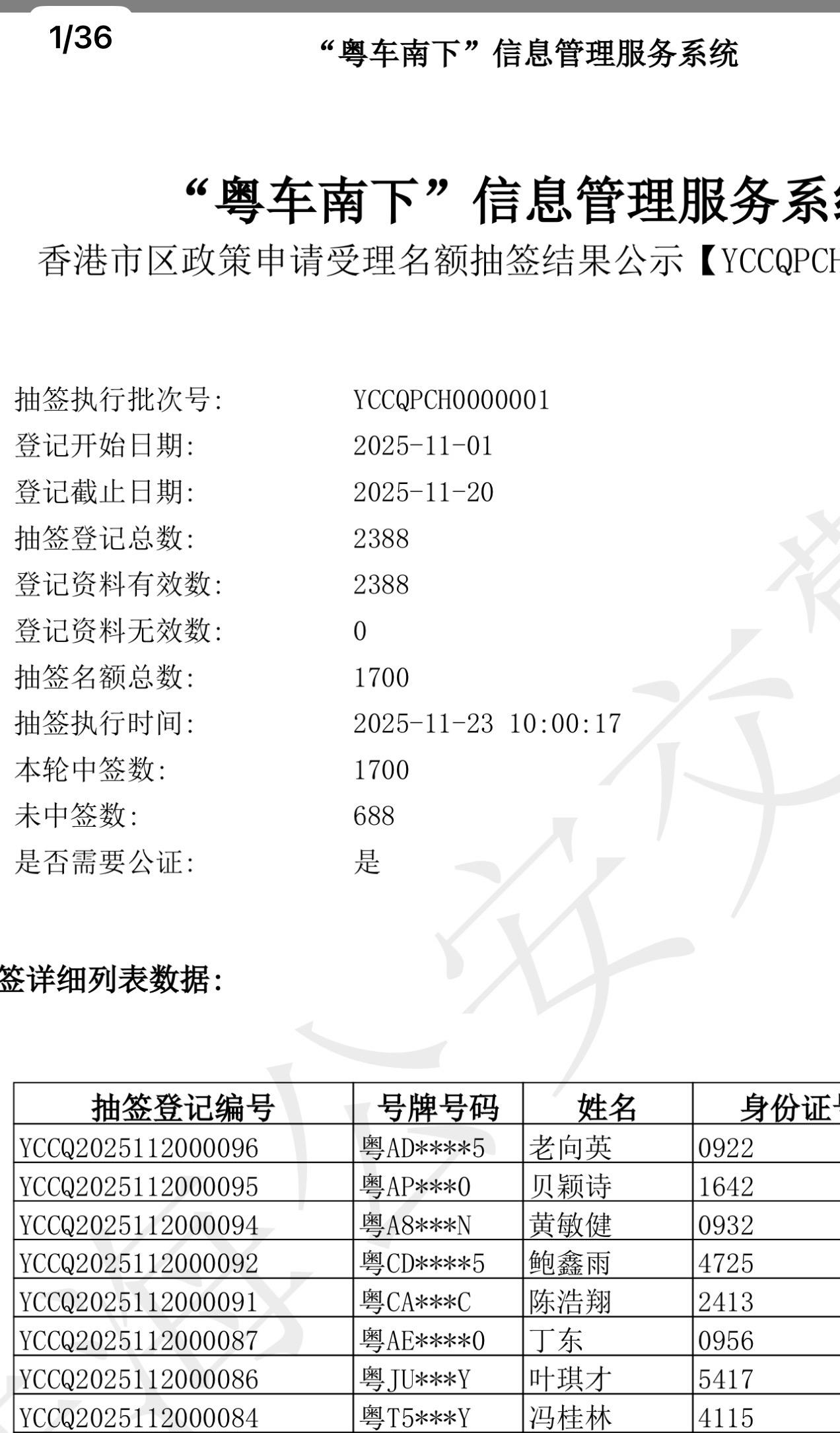 粤车南下抽签今日出炉!我中签啦 实际1700个名额,一共只有2388个报名 所以中签率真的很高 11月1日开放报名系统,当日就有超过500人报名 11月20日最后一日报名,也有100人参加 最sad的是,第一位通过报名的朋友:没中签….. —————- 现在等待验车预约和第一批申请进入市区【来自懂车帝车友圈】