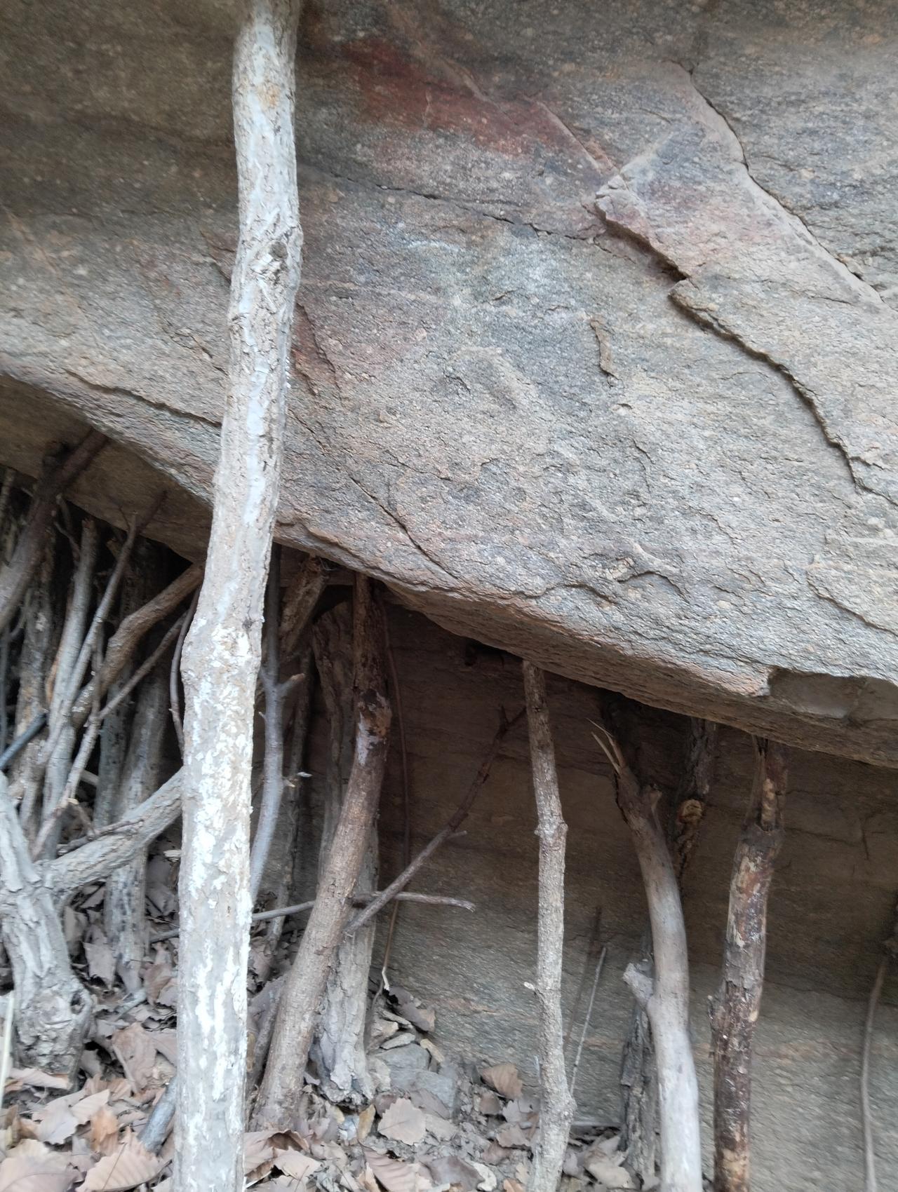 磁山的悬崖峭壁下,为什么用这个木棍来支这个巨石? 这么粗细木棍能支住巨石吗? 这