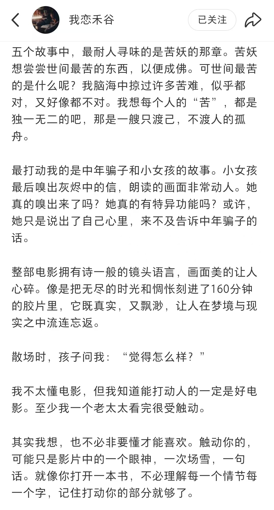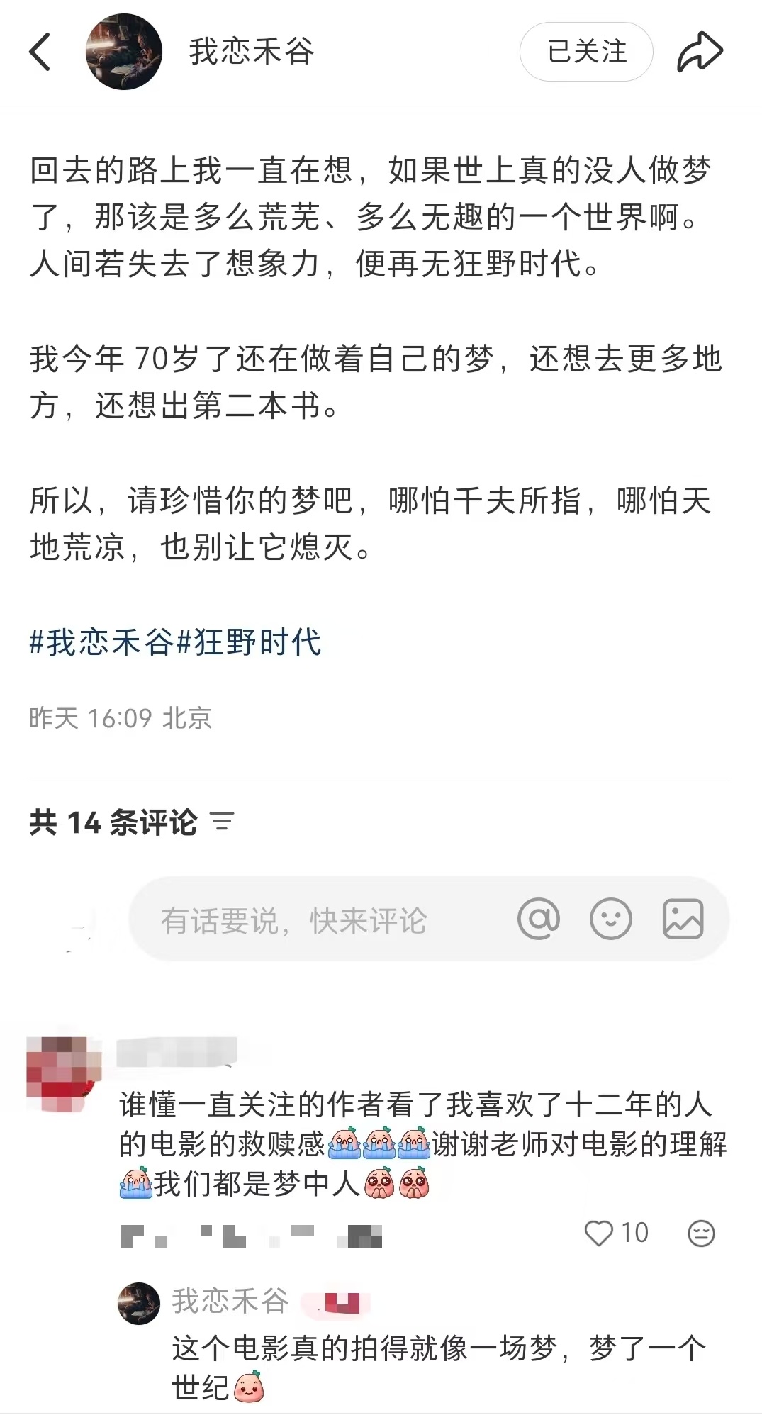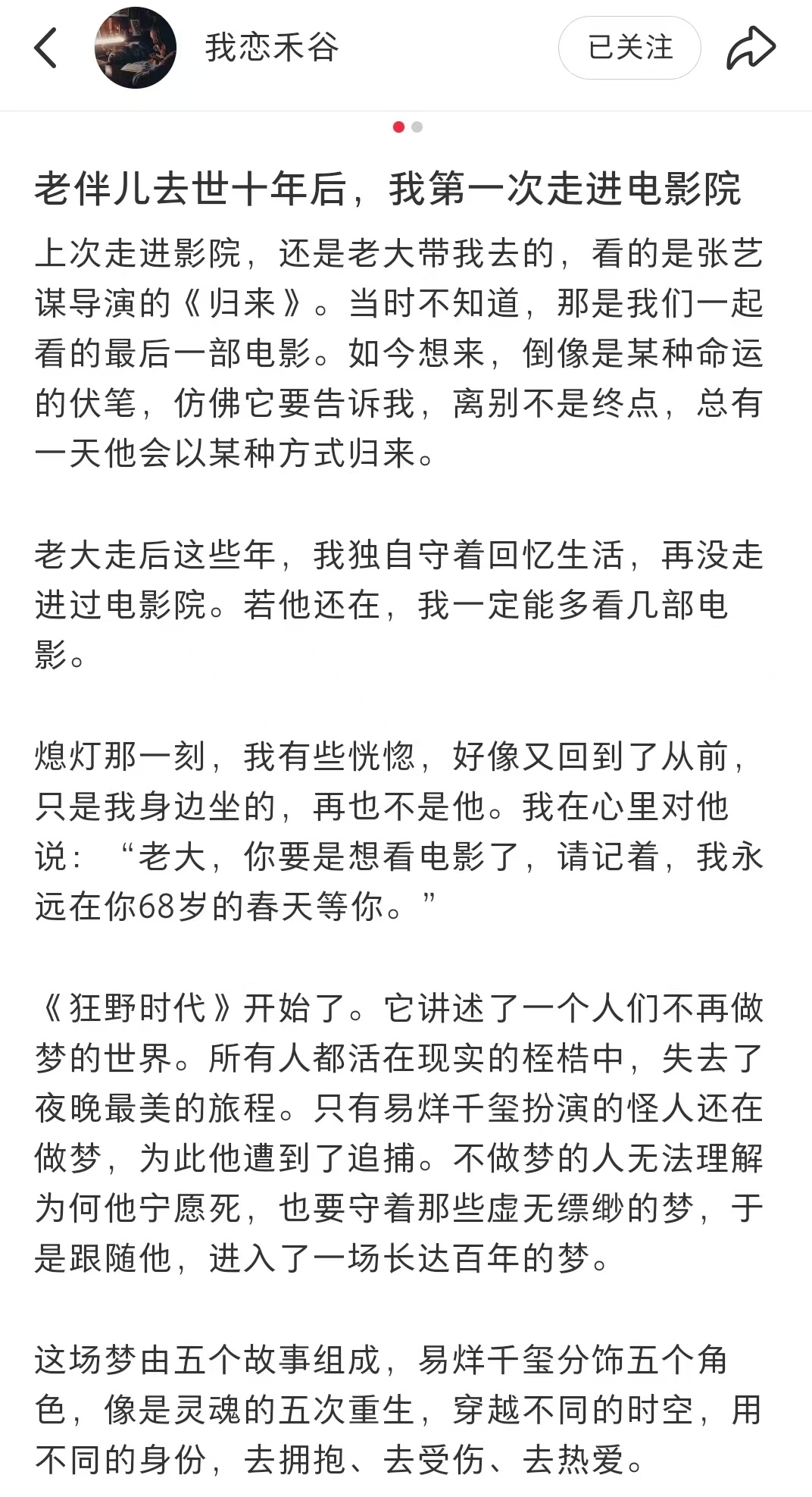 刷到作家玉珍奶奶的文章《老伴儿去世十年后,我第一次走进电影院》,眼眶湿了。 她说,老伴走后十年,她再没走进过电影院。 她说,这次看《狂野时代》,她恍惚觉得,他还在身边。 她说,她今年70岁了,还在做着自己的梦。我一边读,一边想起《狂野时代》里那个执迷于做梦的迷魂者。他不愿活在无梦的现实,哪怕被追捕、被伤害,也要守护那些看似虚无的梦。 而玉珍奶奶在失去挚爱十年之后,依然愿意独自走进影厅,去看一场关于梦的电影。做梦不是年轻人的特权,也不是艺术家的独白。它是每一个普通人,在经历了生离死别、岁月沧桑之后,还是想相信的另一种可能。 玉珍奶奶68岁才开始写作,70岁出了第一本书,书封面写着:“土地记得所有的生生死死,我们如此渺小,却又如此顽强,在风雨里扎根,向岁月讨要收成。” 这不正是迷魂者穿越百年梦境、不断重生的写照吗 我们每个人,都是在自己的时代里,一边失去,一边扎根,一边做梦,一边向岁月讨要那一点点收成。 《狂野时代》是一部值得“感受”的电影。就像玉珍奶奶说的:“不必非要懂才能喜欢,记住打动你的部分就够了。”喜欢的作家写了喜欢的电影,何其幸福。愿我们任何时候都能坦然做梦!