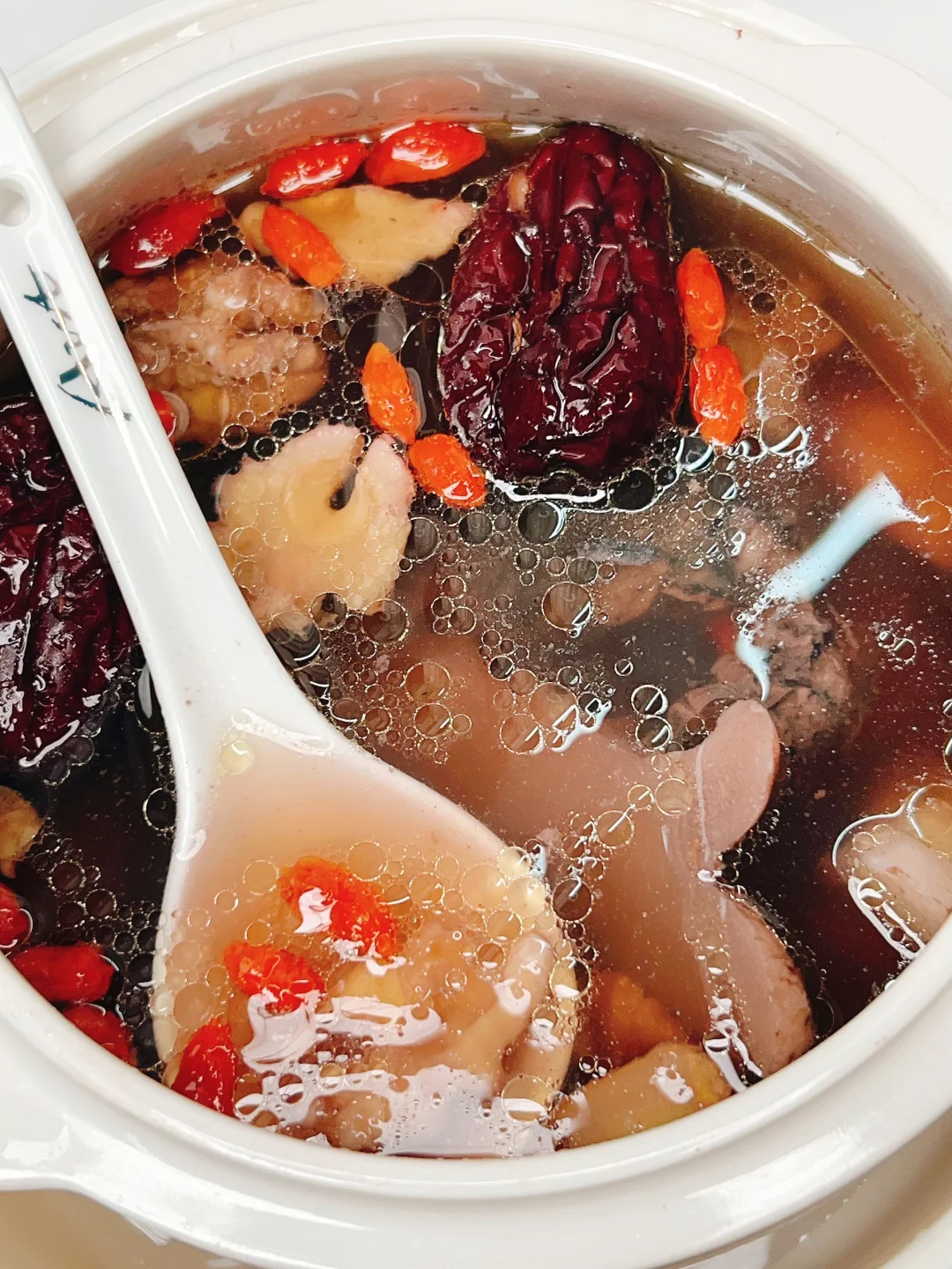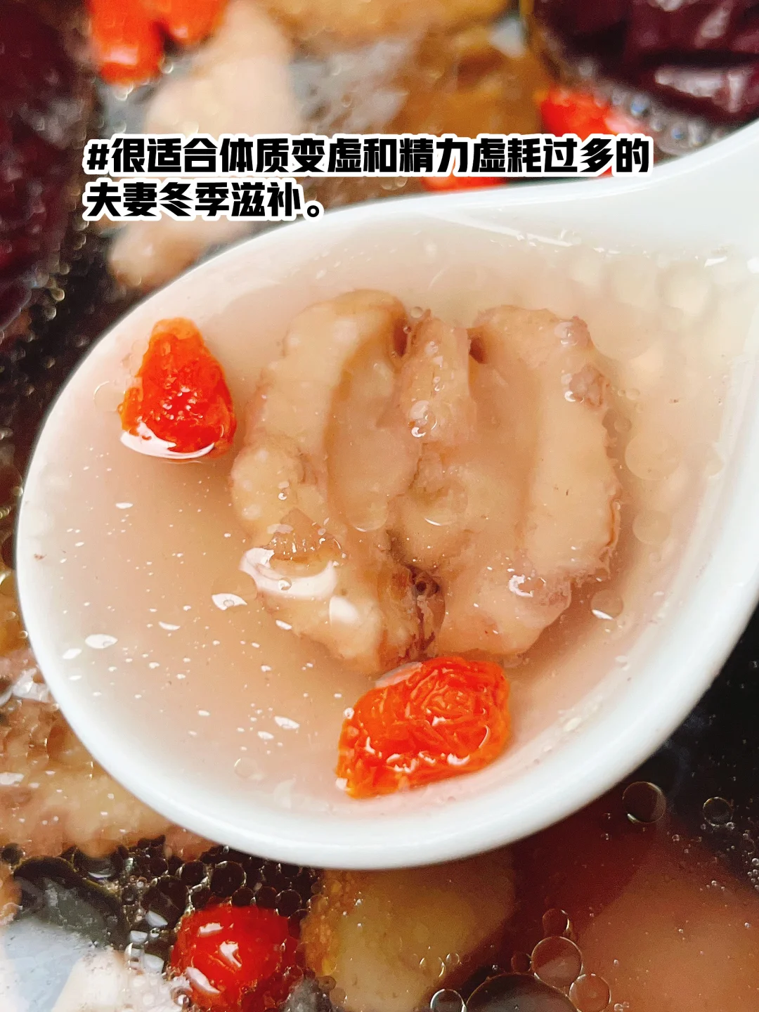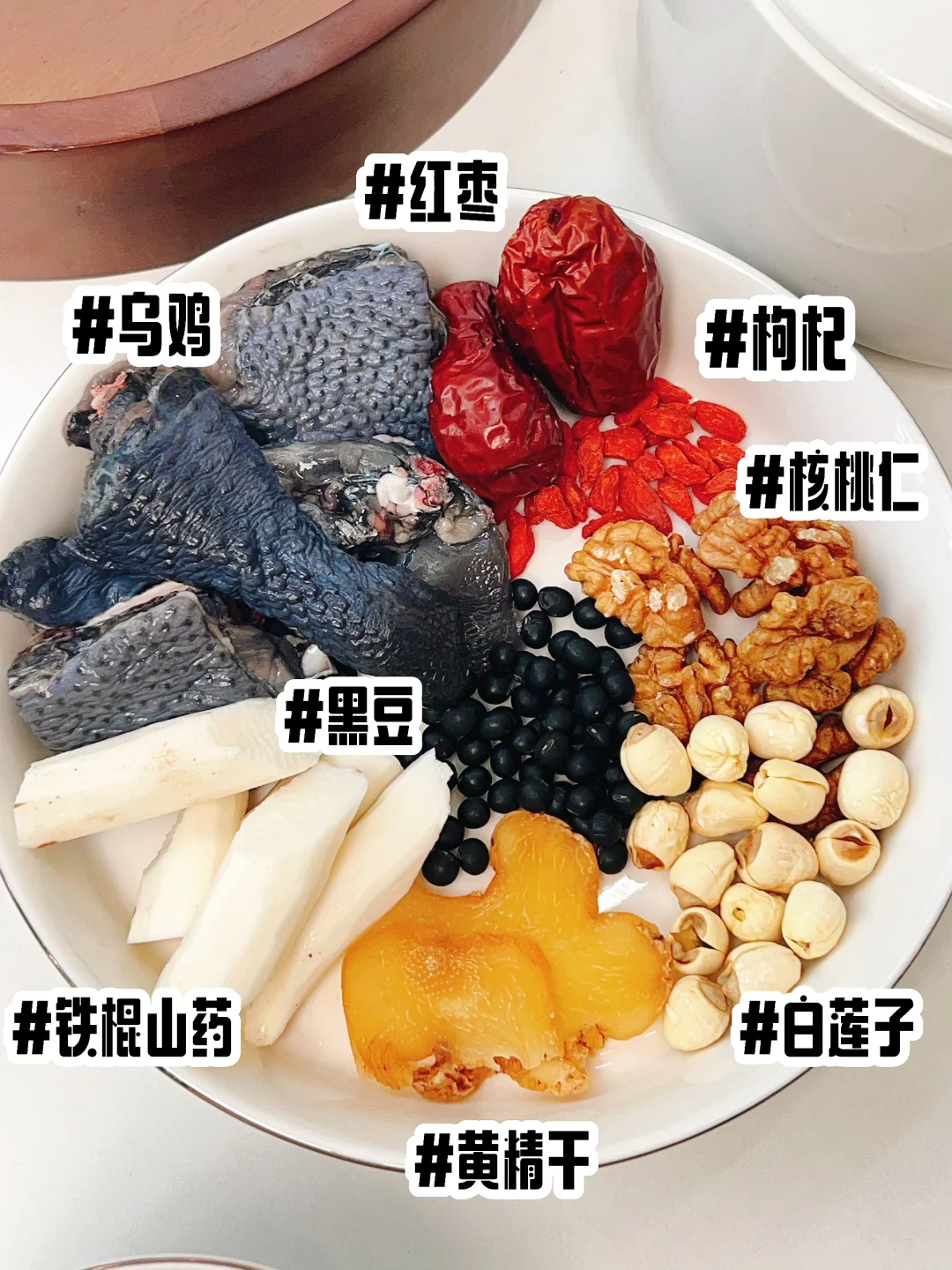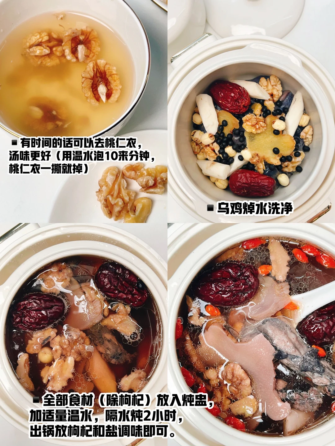 冬季主藏,滋补以肾为主, 肾气够足才是女人血气的基础和男人精力的底气 这盅经典的滋补汤,很适合精力亏虚、体质虚又易上火的夫妻冬季滋补。下午5-7点肾经当令,正是晚饭前很不错的餐前汤。 ——▪️食材: ▫️生核桃仁▫️黄精干▫️白莲子▫️黑豆 ▫️铁棍山药▫️红枣▫️枸杞▫️乌鸡 ⭕️核桃仁、黑豆、黄精补入肾养阴滋补而不火 ⭕️莲子、山药健脾肾,增进吸收。 ——▪️做法: ▫️有时间的话可以去桃仁衣,桃仁衣略带甘苦 (用温水泡10来分钟,桃仁衣一撕就掉) ▫️乌鸡焯水洗净 ▫️全部食材(除枸杞)放入炖盅,加适量温水, 隔水炖2小时,出锅放枸杞和盐调味即可。