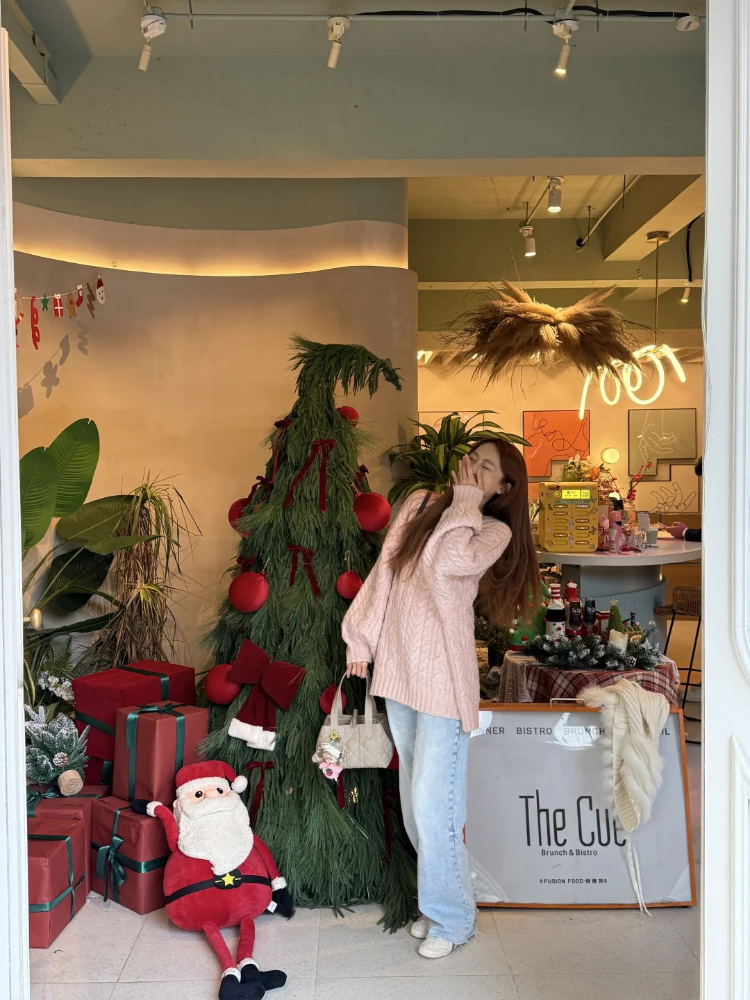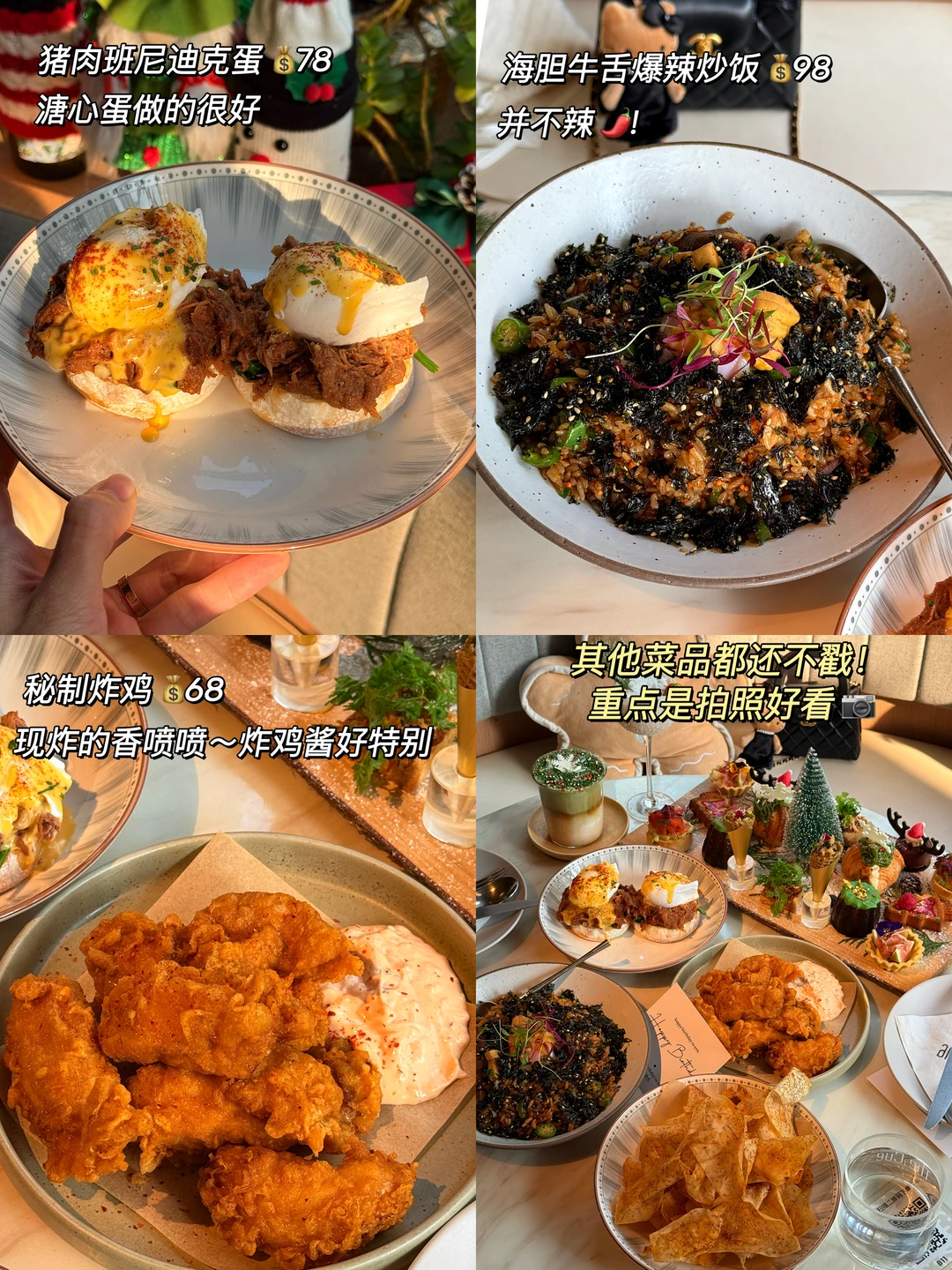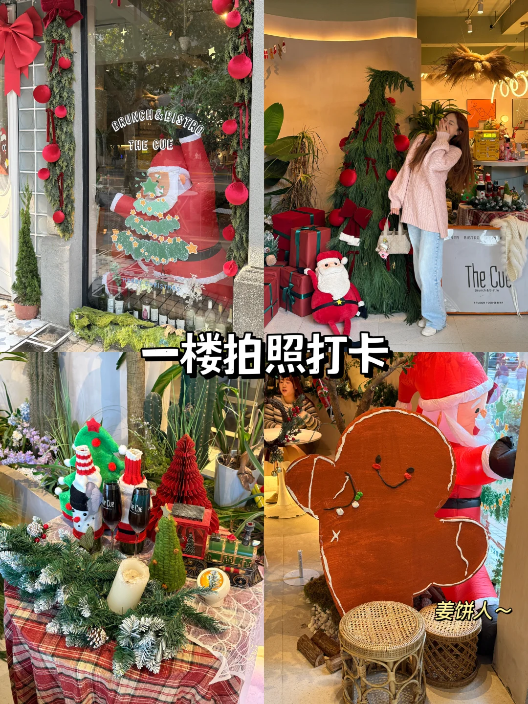 哇一到11月上海就进入了圣诞月! 尤其是淮海中路、武康路地带 街边已经开始逐渐长出“圣诞树🎄”了哦! 这次果果的精选餐厅是这家最近蛮火的the cue 太适合周末和小姐妹来打卡拍照吃漂亮下午茶啦☕️ ▫️推荐菜品 1️⃣圣诞下午茶☕️256 甜点、咸点共8颗!一端上来真的是艺术品存在🎄华丽丽的和姐妹先拍了好多照片! 我觉得这里好吃的是树莓可露丽~外壳是焦糖脆壳,咬开后里面是奶香的哏啾啾的布丁🍮法芙娜慕斯蛮特别做成了驯鹿形状,饼干底+巧克力慕斯,吃多了比较腻[汗颜R]虾仁黑鱼籽蛋筒做的略咸,感觉他家咸点还可以再优化一下! 2️⃣秘制炸鸡🍗68 现炸的一端上来就被香味占领了~他家采用的是无骨鸡所以吃起来比较爽!旁边配了一个很特别的酱料,搭配着吃很上头 3️⃣海胆牛舌火爆辣炒饭🥘98 放了好多海苔碎、鱼籽,个人感觉微微辣没有到“爆辣”的程度🌶️牛舌片的很薄伴着米饭吃太香啦! 4️⃣猪肉班尼迪克🍳78 手撕猪肉腌制稍微甜了一些~但是整体面包体很松软,我个人还蛮喜欢的,每次都超级享受切开溏心蛋的过程[心心眼R] 饮品点了圣诞限定饮品🍸因为是生日所以店家贴心的送了一块生日蛋糕!超惊喜呀[哇R]吃完和姐妹直接步行300米citywalk武康路~ 秋冬天的上海竟然也超适合压马路的🚶快