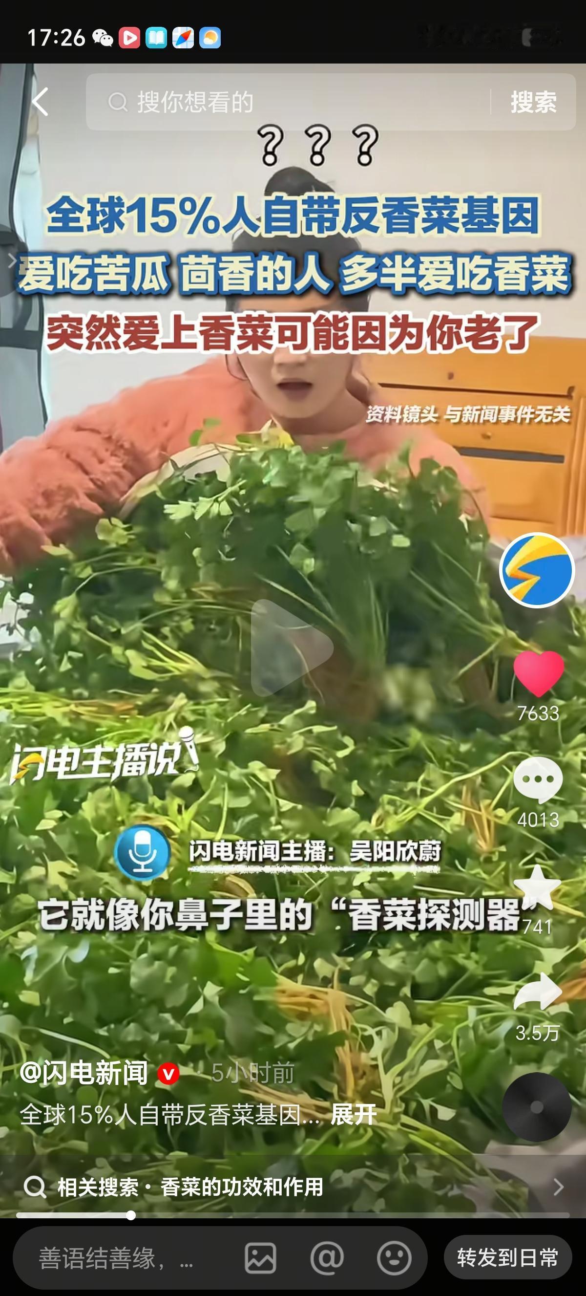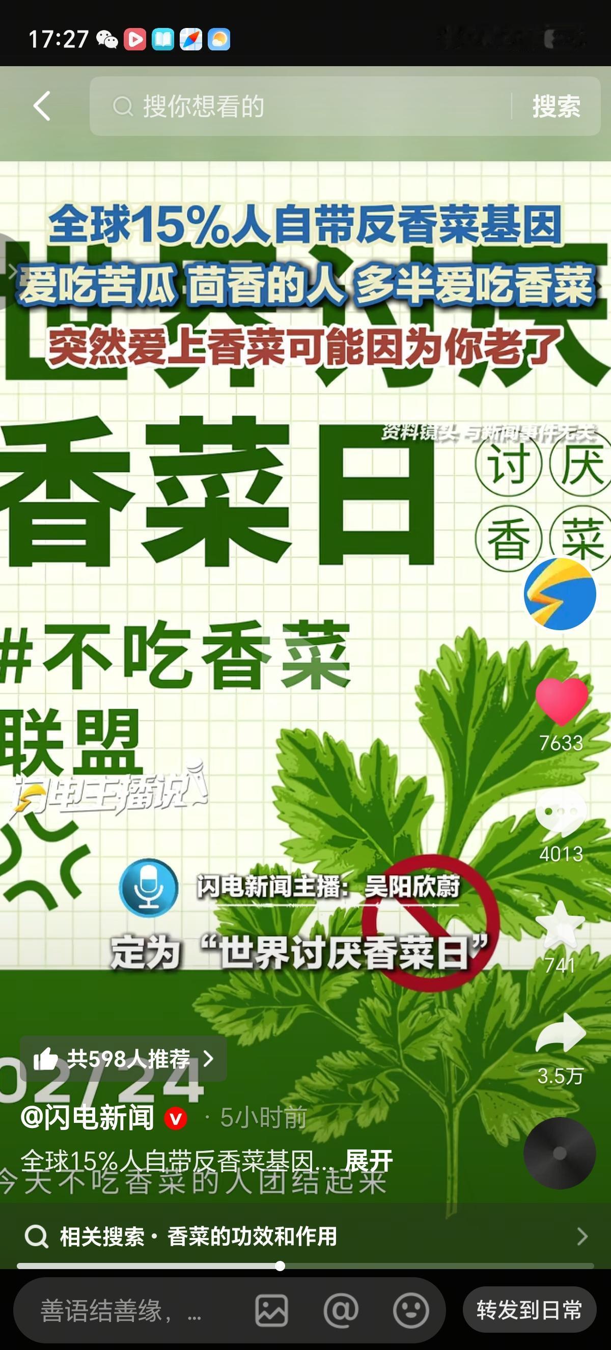 全球15%的人有反香菜基因,哪天离开“反香菜阵营”,就说明你老了。 你身边有没有这样的人?吃火锅、拌凉菜时,恨不得把香菜当主食,一口下去香到跺脚;但也有人见了香菜就浑身难受,菜里哪怕混一根香菜叶,都得仔仔细细挑出来,甚至觉得“味同嚼蜡”。别再吐槽他们矫情啦,这真不是挑食,全球大概15%的人都自带“反香菜基因”,对香菜的厌恶,从根上就是天生的! 这一切的“始作俑者”,是我们11号染色体上的OR6A2基因。你可以把它想象成一个超级灵敏的“气味探测器”,专门负责捕捉食物里的特殊气味。香菜之所以闻着特别,核心是含有一种叫“反式-2-癸烯醛”的物质,有意思的是,这种成分不仅在香菜里有,肥皂和臭虫的分泌物里也存在! 对于携带变异OR6A2基因的人来说,这个“探测器”简直太活跃了,能一下子抓住香菜里的这种成分,然后给大脑发信号:“警告!这东西有肥皂味/臭虫味!” 大脑一接收到这个信息,自然就会本能排斥,觉得香菜难吃到不行。而且2012年《自然》杂志都做过研究,证实了携带这种基因突变的人,讨厌香菜的概率比普通人高3倍,这可不是瞎编的! 当然,讨厌香菜也不只是这一个基因在“发力”。还有个叫TAS2R10的苦味受体基因,要是有人对香菜里的微量苦味物质特别敏感,再加上对那股“肥皂味”的反感,双重暴击之下,就更难接受香菜了。而且不同地区的“反香菜党”比例还不一样,东亚地区大概有20%,差不多每5个人里就有1个“反香菜斗士”;但中东地区因为饮食里经常用香菜调味,讨厌香菜的人只有3%,差距特别大。更有意思的是,这些“反香菜党”还特别有仪式感,把每年的2月24日定为“世界讨厌香菜日”,算是给彼此找了个“抱团取暖”的理由。 不过也不是说,一辈子讨厌香菜就改不了了。很多人年纪大了之后,味觉和嗅觉会慢慢退化,对香菜里那股讨厌的异味感知变弱,反而能察觉到香菜里芳樟醇的清香。而且中老年人饮食更看重清淡健康,香菜能中和油腻、提鲜增香的优势就显现出来了,不少长辈就这样慢慢接受了香菜。另外,要是长期待在常吃香菜的饮食环境里,就算自带敏感基因,也可能慢慢脱敏。我身边就有朋友,以前吃香菜像吃药,后来跟着家人天天吃,慢慢就不觉得难闻了,现在甚至能接受香菜拌豆腐,从“避香菜党”成功逆袭成“爱香菜党”。 所以下次聚餐,再遇到有人挑香菜,可别再笑话他们挑食啦。这不过是基因给味觉设定的小偏好,就像有人天生怕辣、有人天生爱吃甜一样,没什么好纠结的。说不定哪天,那些现在讨厌香菜的人,突然就解锁了香菜的美味,加入“香菜爱好者”阵营呢!