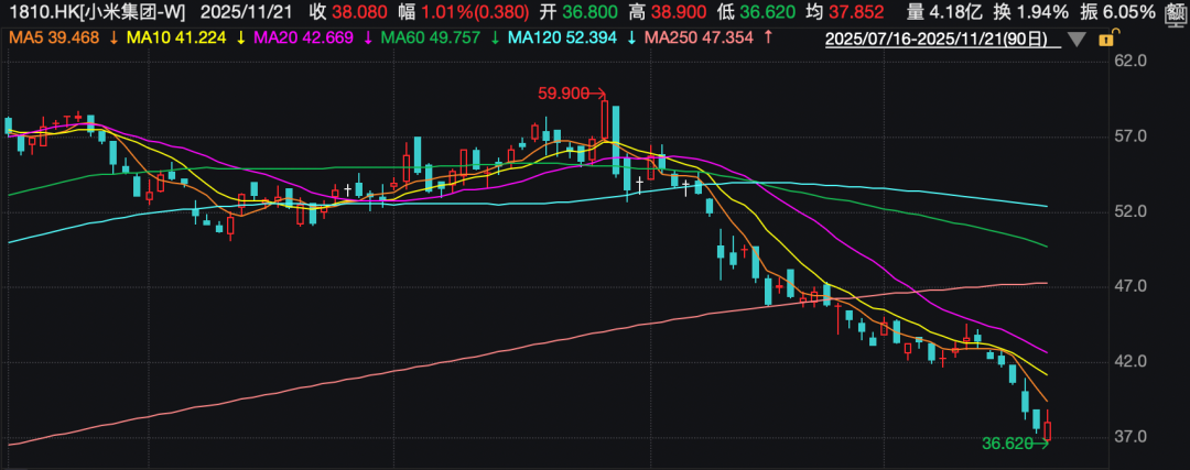 近期,小米集团(01810.HK)股价整体呈现持续走低态势,从近60港元/股跌至38港元/股附近。
