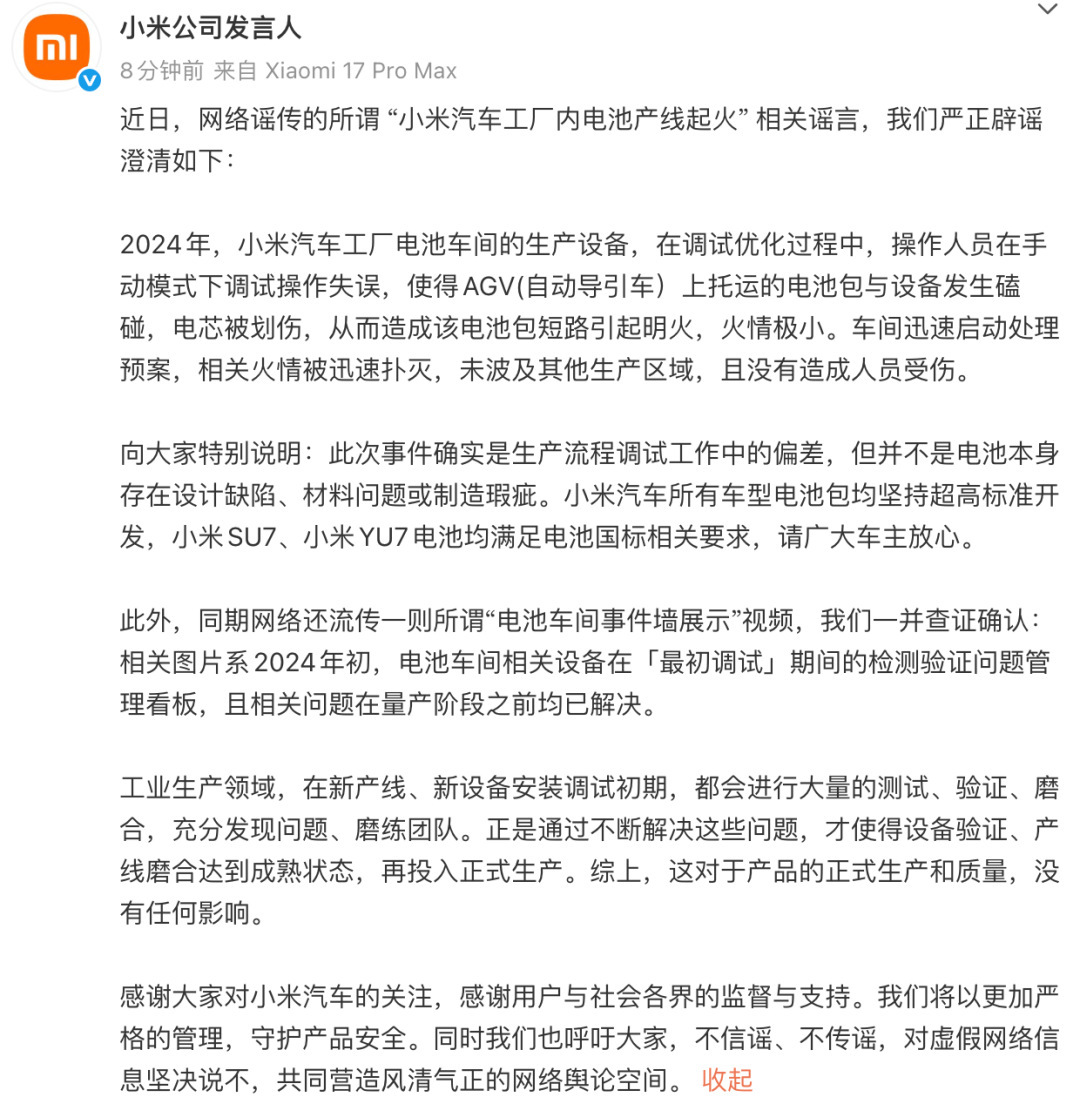 小米强调,此次事件确实是生产流程调试工作中的偏差,但并不是电池本身存在设计缺陷、材料问题或制造瑕疵。小米汽车所有车型电池包均坚持超高标准开发,小米SU7、小米YU7电池均满足电池国标相关要求。此外,小米表示,网络还流传一则所谓“电池车间事件墙展示”视频,“我们一并查证确认:相关图片系2024年初,电池车间相关设备在‘最初调试’期间的检测验证问题管理看板,且相关问题在量产阶段之前均已解决。”小米表示,工业生产领域,在新产线、新设备安装调试初期,都会进行大量的测试、验证、磨合,充分发现问题、磨练团队。正是通过不断解决这些问题,才使得设备验证、产线磨合达到成熟状态,再投入正式生产。综上,这对于产品的正式生产和质量,没有任何影响。