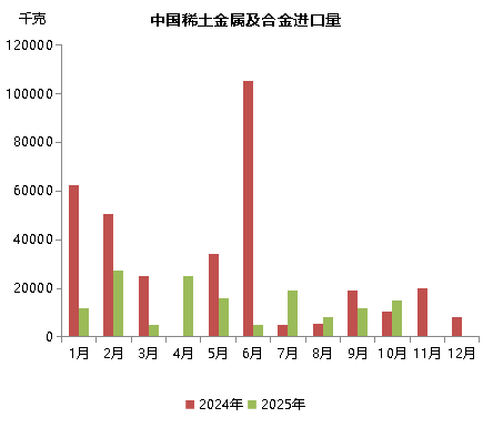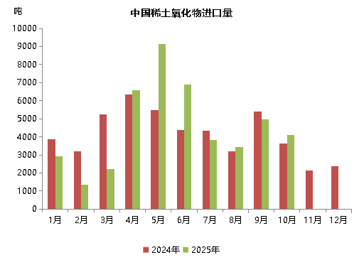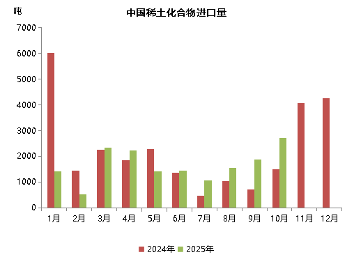 2025年1-10月份,我国累计进口稀土金属及合金约为144.5吨,同比下降54.5%;同期进口稀土氧化物4.5万吨,同比增加0.7%;同期进口稀土化合物约1.7万吨,同比下降12.3%。