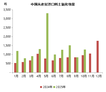 2025年1-10月,我国从老挝进口1.3万吨稀土氧化物,同比增长27.2%,占同期氧化物总进口量的29.5%,进口品种全部为“未列名氧化稀土”。其中,8月份进口量达到1278吨,同比增长32.4%。今年我国基本没有从老挝进口稀土化合物,仅10月份进口9.7吨。
