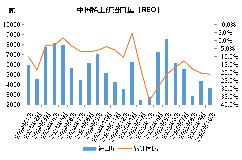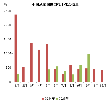 今年以来,缅甸稀土原料进口波动较大,6月达到年内高点,超过5000吨,8月份大幅度下滑到1500吨,10月份为2537吨。2025年1-10月份,我国从缅甸进口2.8万吨稀土氧化物,同比下降约18.4%;进口量占同期氧化物总进口量的62%,低于去年同期的69.5%,进口品种全部为“未列名氧化稀土”;1-10月,我国从缅甸进口3510吨稀土化合物,同比萎缩64.5%,占比为21.2%,进口品种全部为“其他未列名稀土金属及其混合物的化合物”。据测算,2025年1-10月,我国从缅甸进口的稀土原料中(稀土氧化物和稀土化合物),REO总含量同比下降约18.9%。
