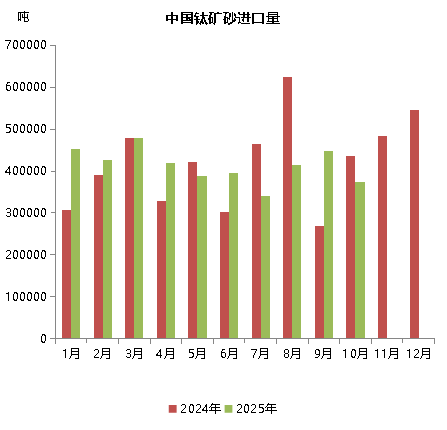 2025年1-10月份,我国进口413万吨钛矿砂,同比增加2.9%。