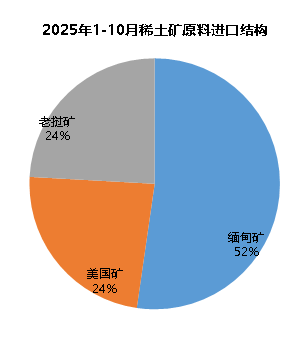 从稀土原料的进口国别来看,美国矿(稀土精矿)进口自8月以来已归零,缅甸矿(稀土中间冶炼产品)进口量进一步下降,老挝矿(稀土中间冶炼产品)保持增长。1-10月,我国从缅甸进口的稀土原料占比提高到52%,而美国矿占比大幅下降到24%,老挝矿占比为24%。