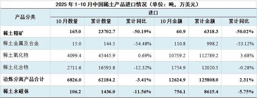 四、2025年1-10月稀土冶炼分离产品进口量同比下降8.7%