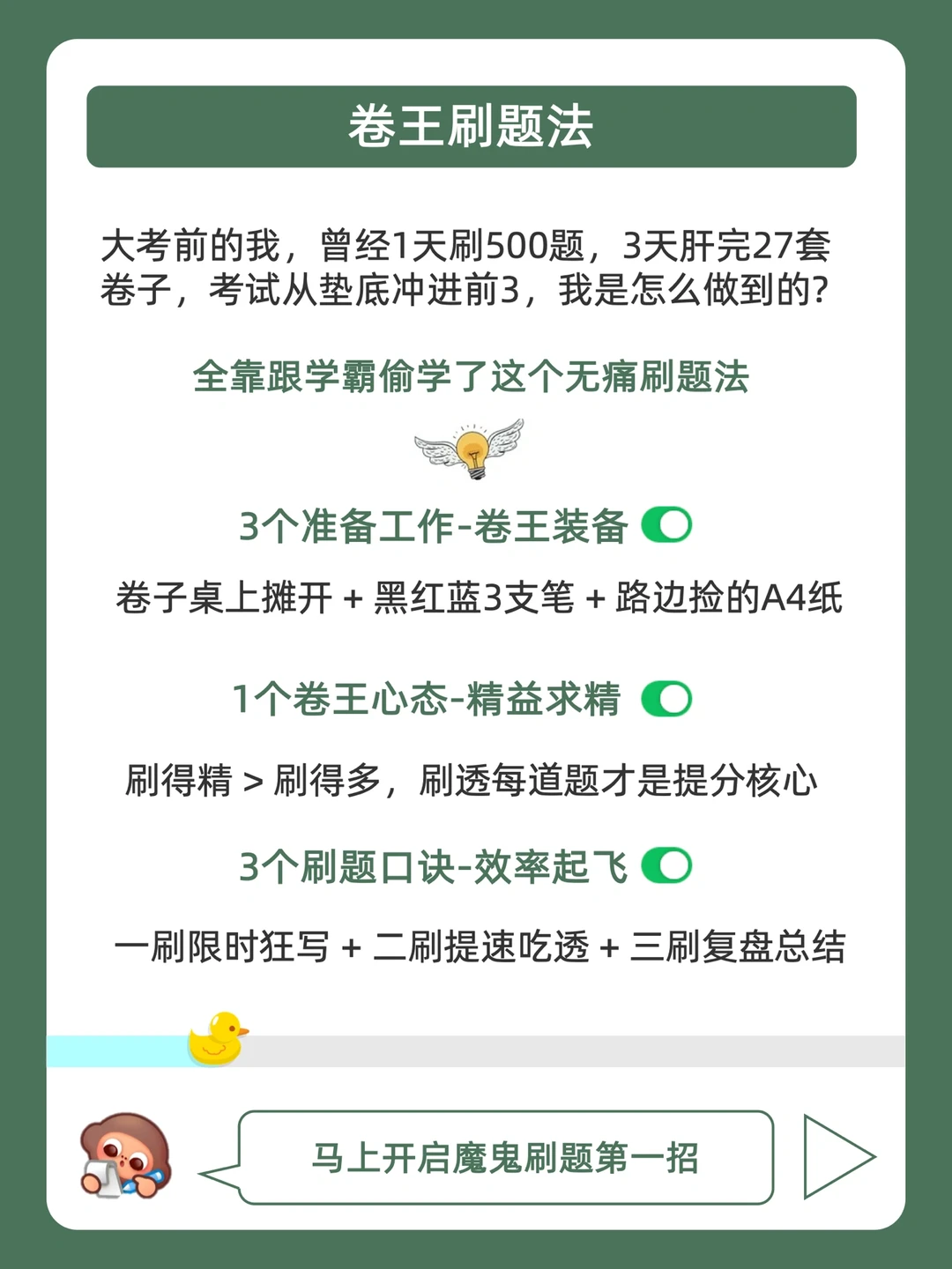 · [赞R]学习摆烂不用怕,鸭鸭带你做卷王❗️ · [哇R]拿下这篇卷王刷题法,你刷1题顶别人刷10题!🚀 . [偷笑R]赶紧偷学起来,这可是学霸间很火的刷题方法❗ . 🐣我是鸭鸭,持续分享更多优质学习方法,陪宝子们快乐学习,驰骋学海!🌊