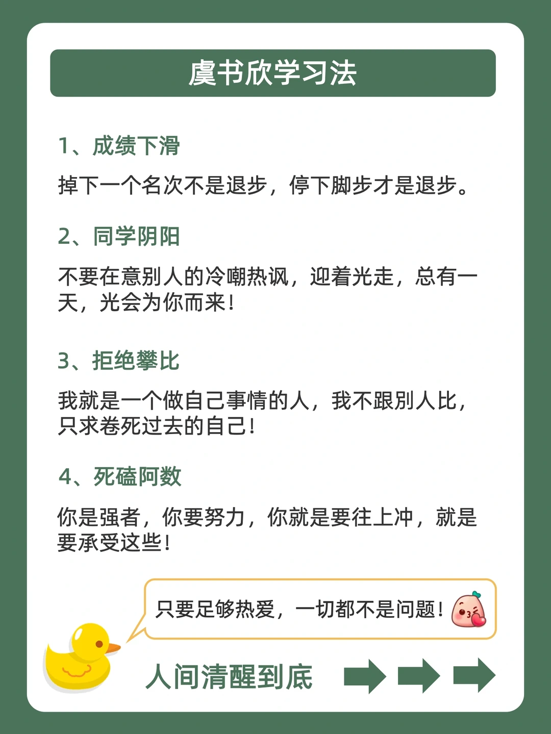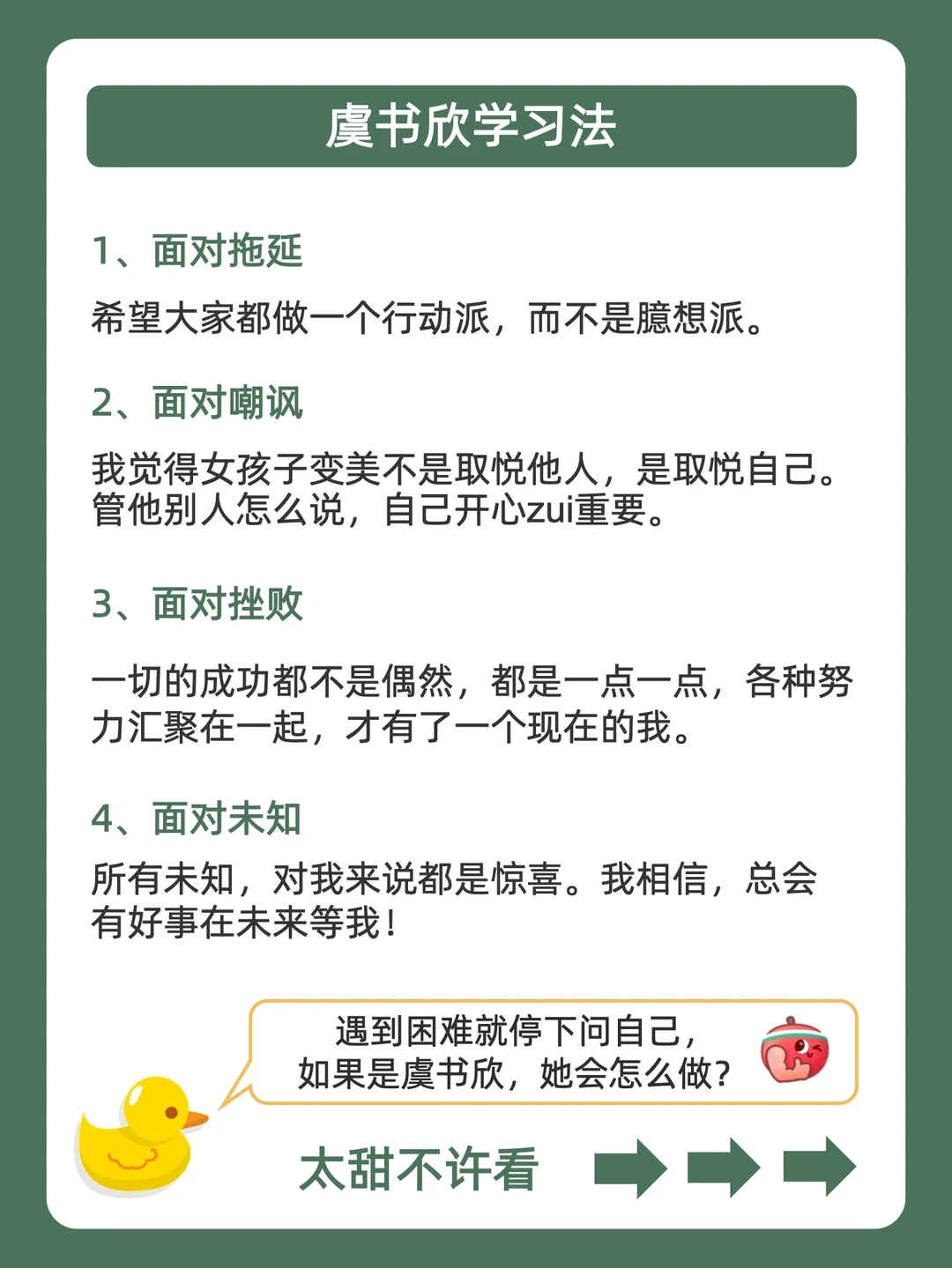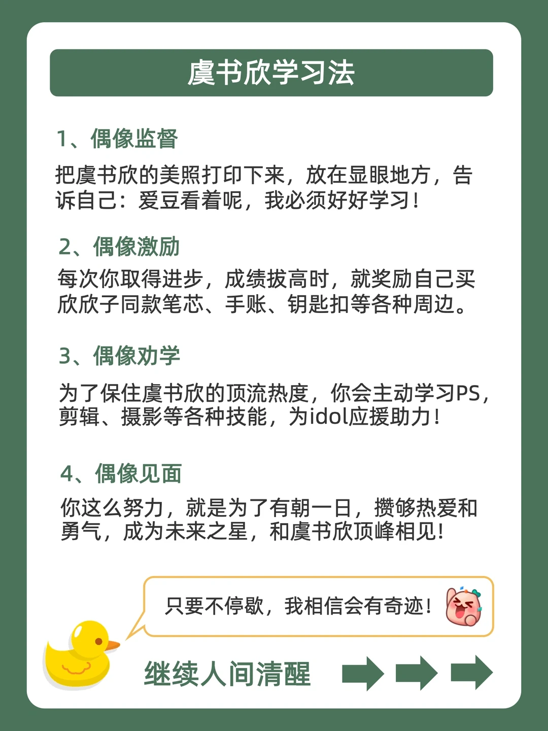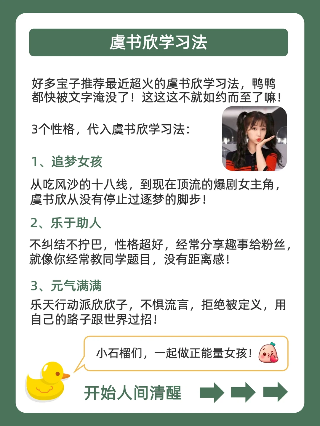 . [赞R]用学习方法帮你变成学霸,是鸭鸭的责任❗ . [向右R]有宝子说鞠婧祎学习法都出了,虞书欣学习法也必须快马加鞭安排上![石化R] . [点赞R]鸭鸭这么宠粉,宝子们的投稿和建议都会认真对待的哇![哇R] . 今天就来分享,虞书欣学习法,都在上面的图,看完就会用,从此追星学习,逆袭学霸![赞R] . 🐣我是鸭鸭,持续更新神奇学习方法,陪宝子们快乐逆袭,驰骋学海!🌊