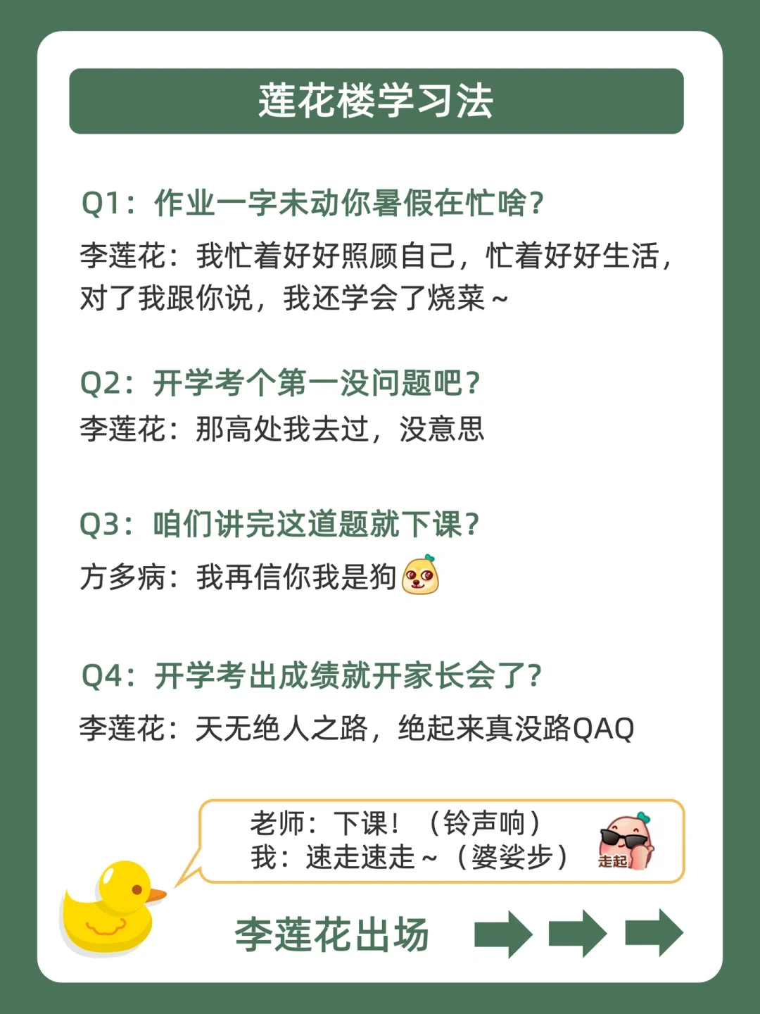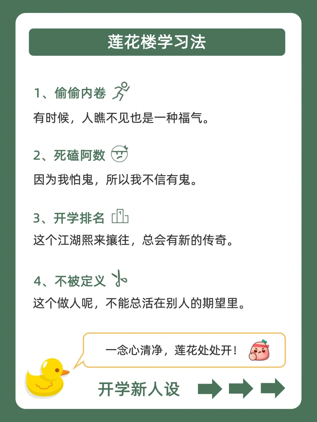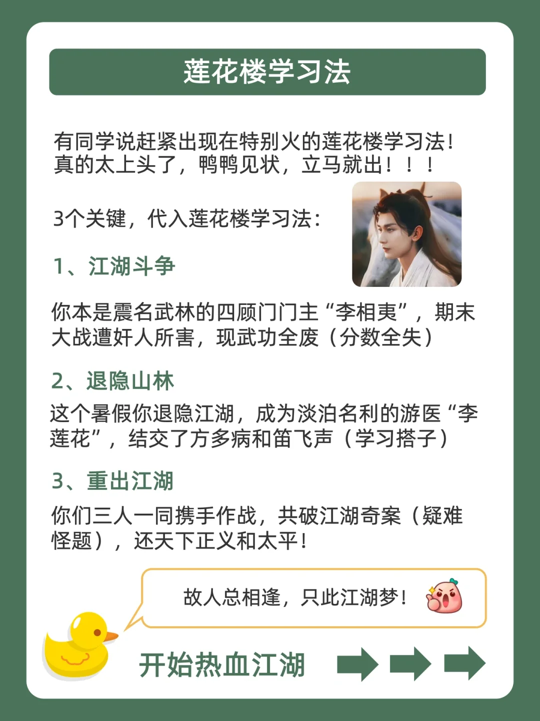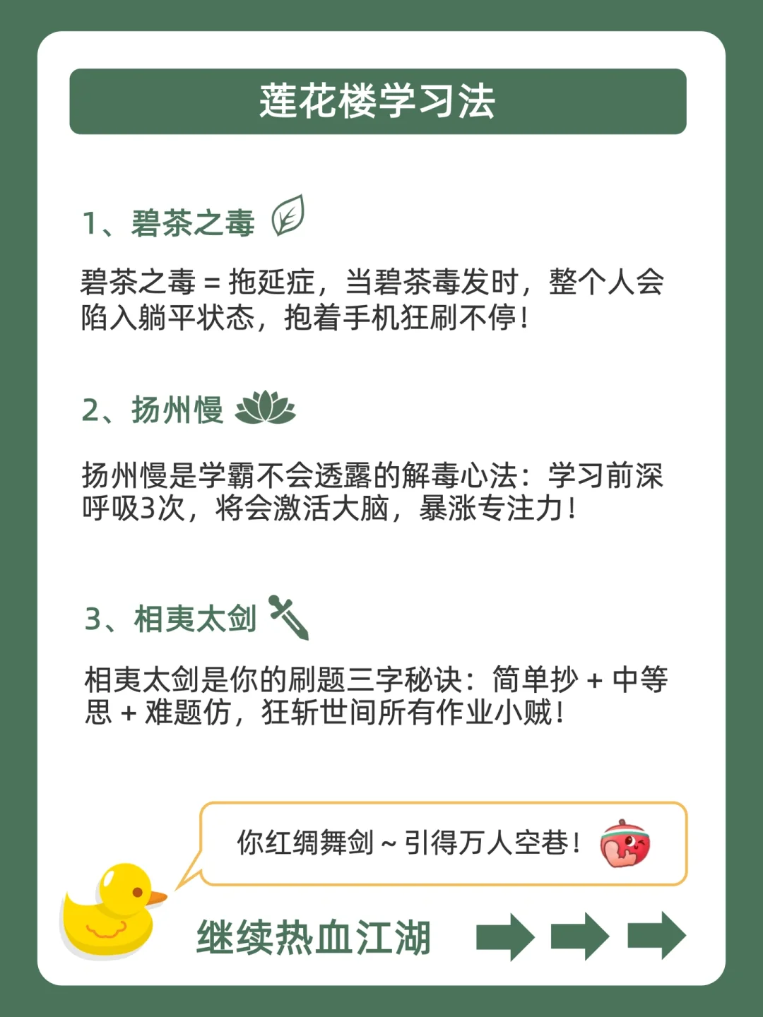 . [赞R]用学习方法帮你变成学霸,是鸭鸭的责任❗ . [向右R]有宝子一直在蹲莲花楼学习法,蹲得腿都麻了![石化R] . [点赞R]鸭鸭这么宠粉,投稿和建议都会认真对待的哇![哇R] . 今天就来分享,莲花楼学习法,都在上面的图,看完就会用,从此武侠学习,逆袭学霸![赞R] . 🐣我是鸭鸭,持续更新神奇学习方法,陪宝子们快乐逆袭,驰骋学海!🌊