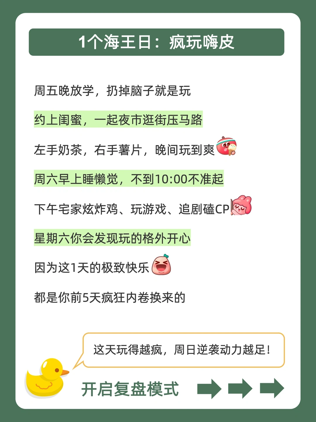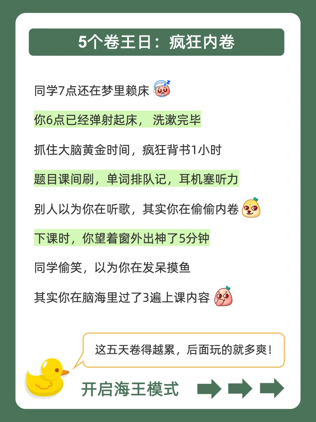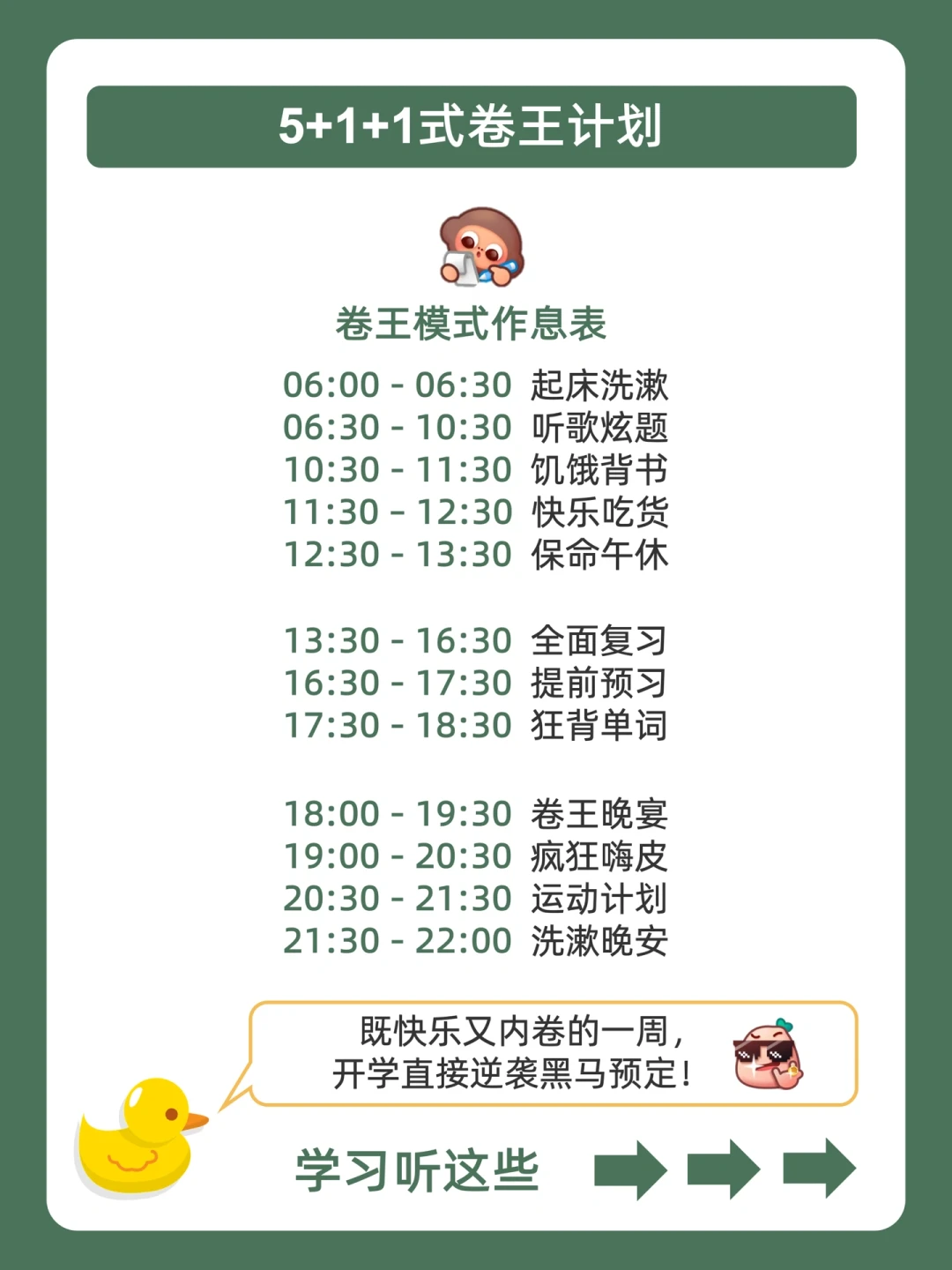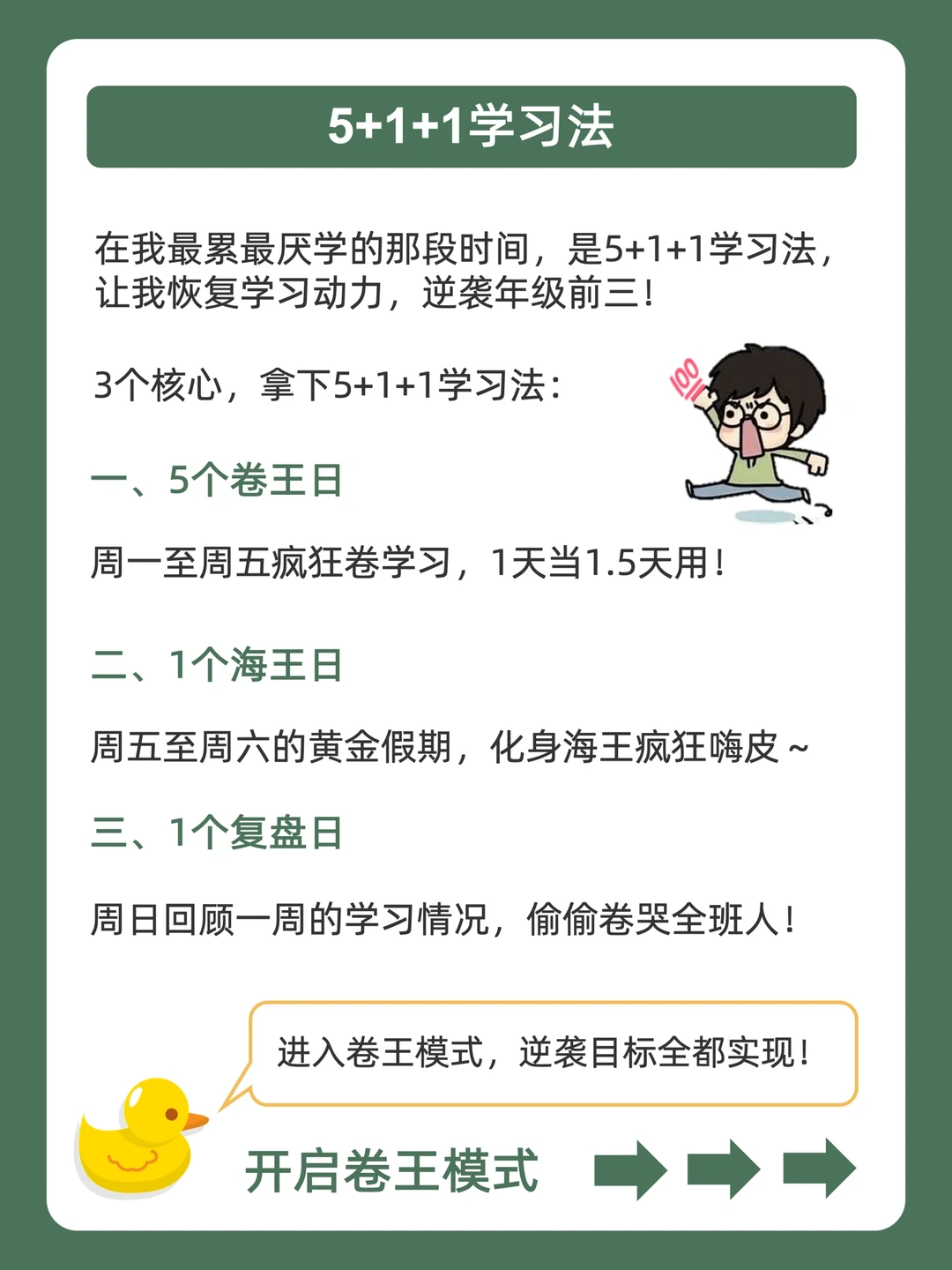 . [赞R]开学摆烂不用怕,鸭鸭带你做学霸❗ . [向右R]有同学说自己焦虑厌学,一周过得都浑浑噩噩![石化R] . [飞吻R]鸭鸭这么宠粉,肯定会全力以赴帮助你们的哇![赞R] . 今天就来分享,5+1+1式学习法,都在上面的图,看完就会用!从此快乐学习,逆袭学霸![赞R] . ️🐣我是鸭鸭,持续更新优质学习方法,陪宝子们逆袭学霸,驰骋学海!🌊