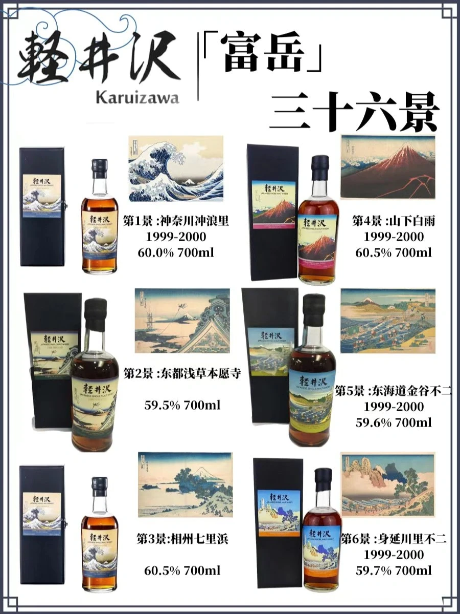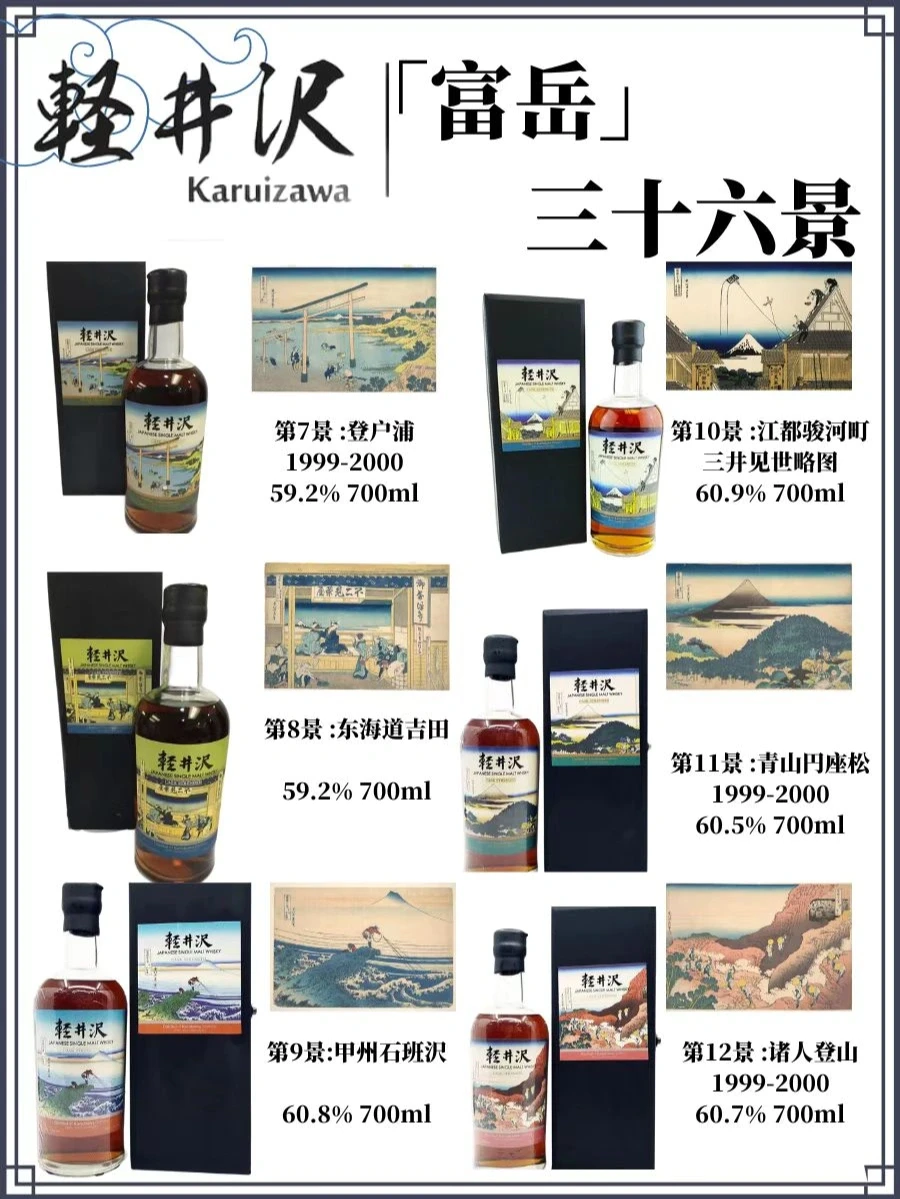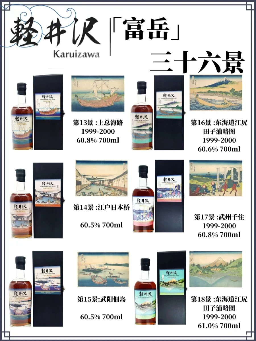 🔥“轻井泽•富岳三十六景”系列就是在关厂前一年选择1999年和2000年的蒸馏原酒,并以原桶强度装瓶。这是轻井泽最后的一个系列作品,有着很高的收藏价值和艺术价值,其流通价值和经济价值体现在价格上应该在七位数上。