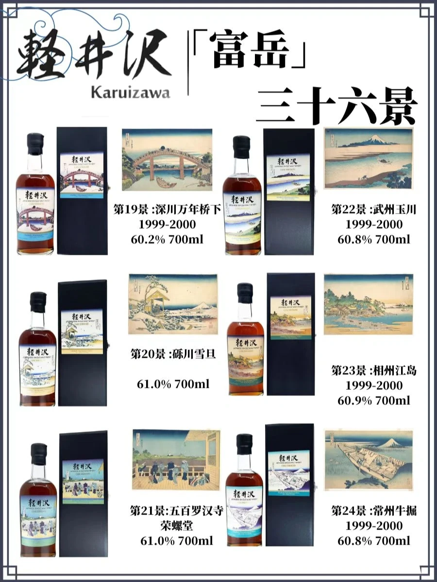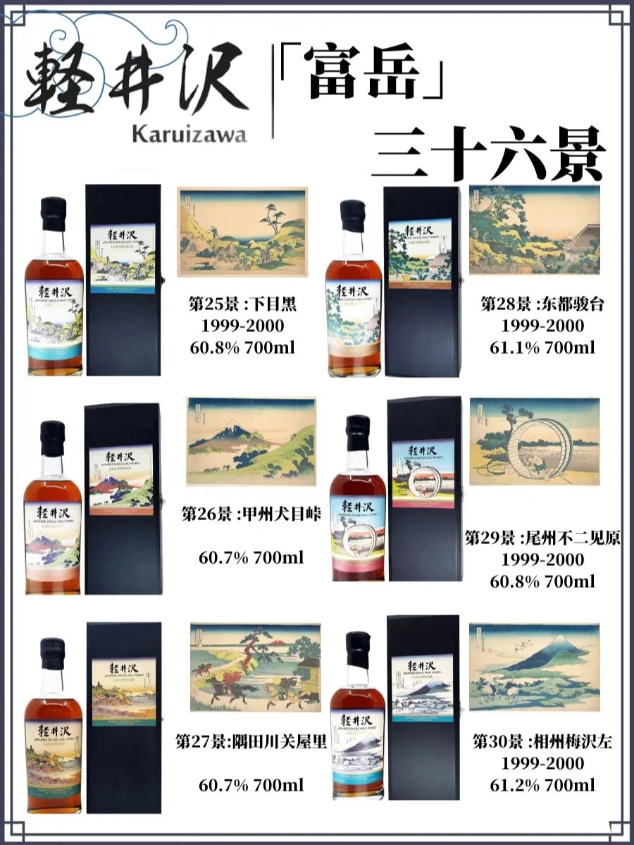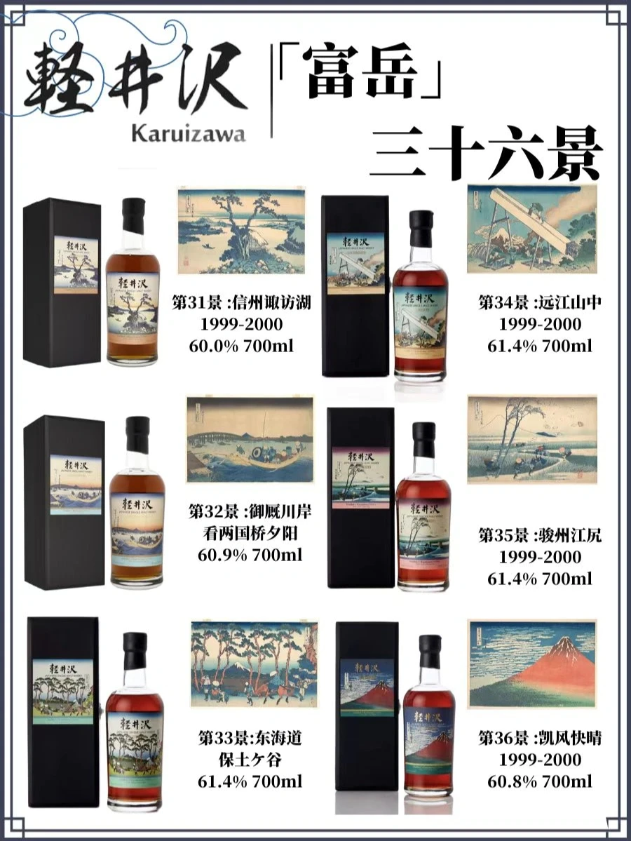🔥“轻井泽•富岳三十六景”系列就是在关厂前一年选择1999年和2000年的蒸馏原酒,并以原桶强度装瓶。这是轻井泽最后的一个系列作品,有着很高的收藏价值和艺术价值,其流通价值和经济价值体现在价格上应该在七位数上。