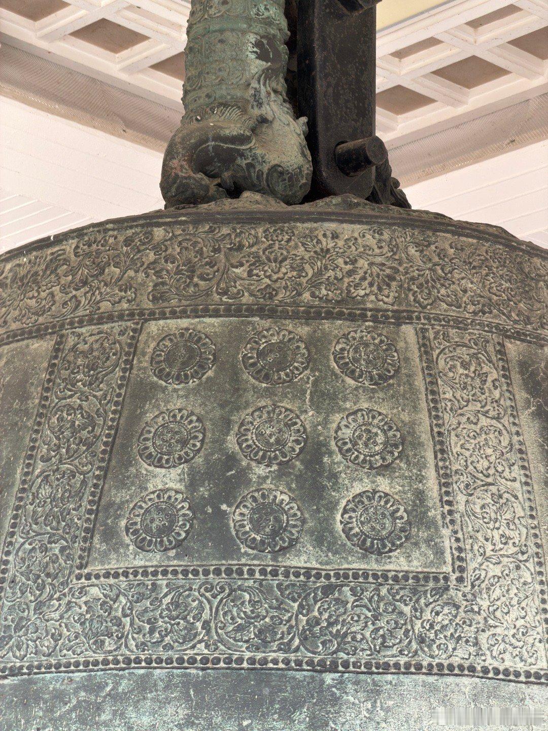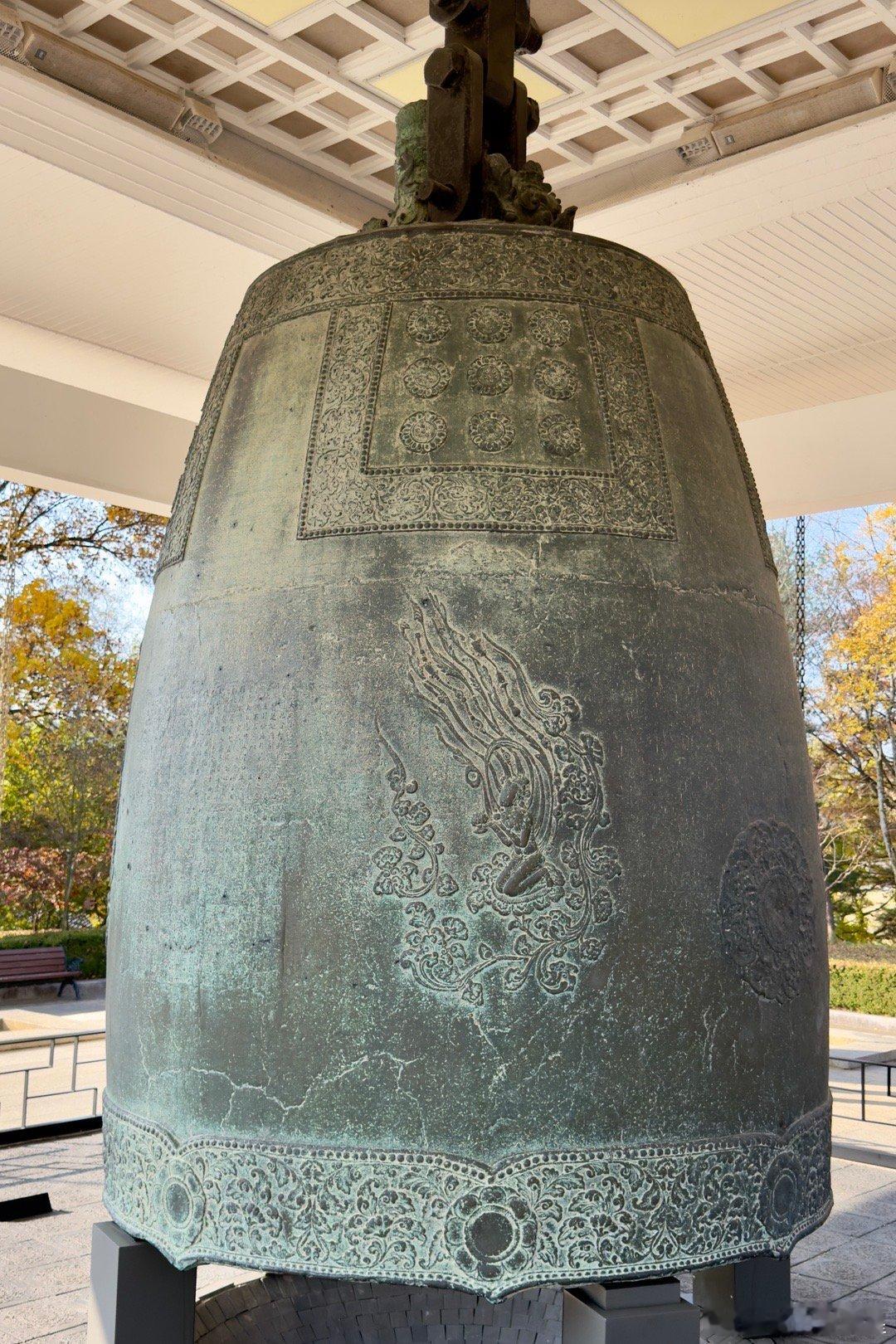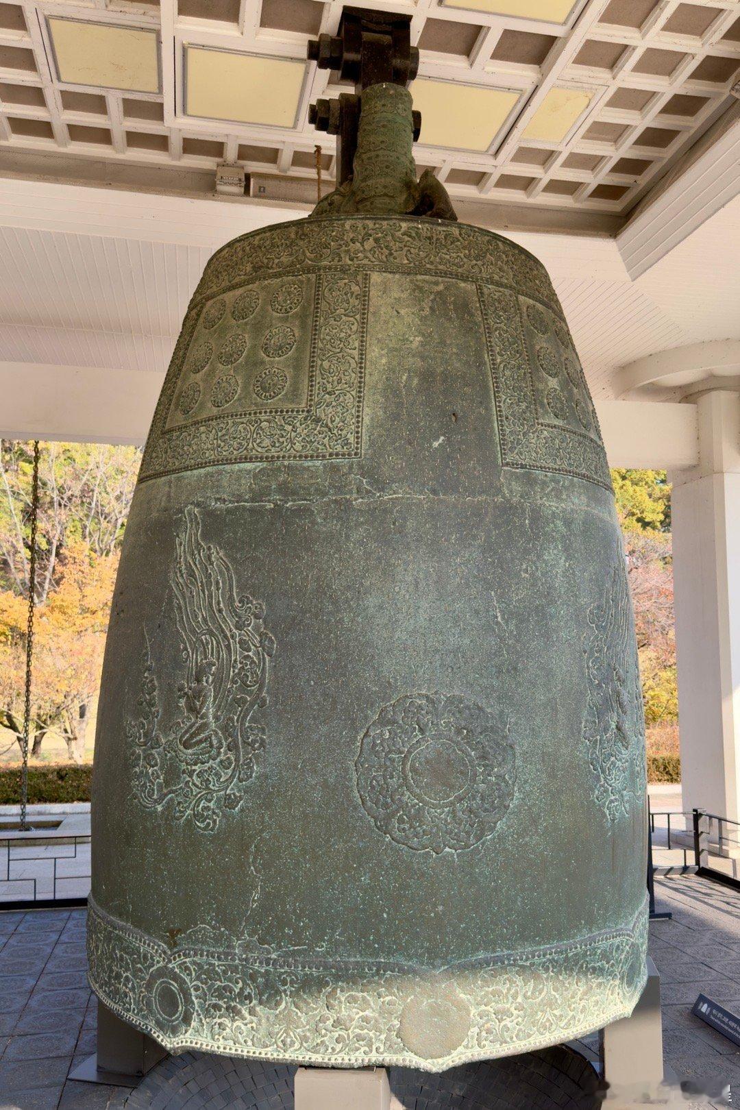 圣德大王神钟,韩国国立庆州博物馆。韩国有没有相当于我国195禁止出境文物级别的至宝呢?那肯定是有的,庆州的圣德大王神钟就是个典型。这个钟是统一新罗时代景德王为纪念其父圣德王下令铸造的佛钟,由惠恭王于唐代宗大历六年岁次辛酉十二月十四日(772年1月)完成。钟通高3.66米,重约18.9吨,号称用铜12万斤。钟身刻有莲花纹、飞天仙女像及1037字铭文。这个钟无论是尺寸、纹饰还是资料价值,都是8世纪东亚第一等的作品。对比一下西安的禁止出境文物景云钟,其铸造于唐睿宗景云二年(711),高2.47米,重6吨,有铭文292字,就可以知道圣德大王神钟确实是非同凡品。当然了,唐代肯定有更大的钟,但没留下来。目前亚洲最大的8世纪铜钟是日本奈良东大寺的梵钟,高3.86米,重26.3吨。这个钟在750年铸造半年后失败,752年用了三个月铸成,在东大寺大佛开眼会前一天才挂好。有可能是工期太紧,纹饰和钟铭都省略了,在艺术性上比景云钟和圣德大王神钟要差很远。宝物亲见,合影留念