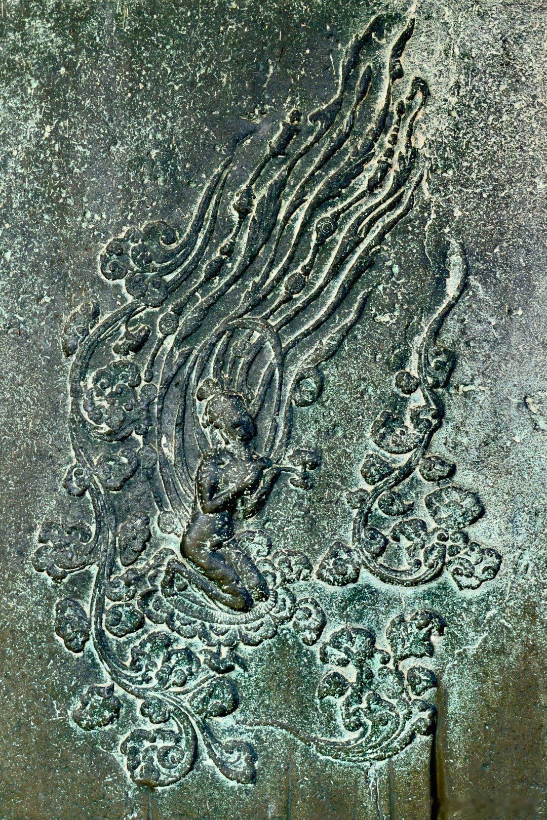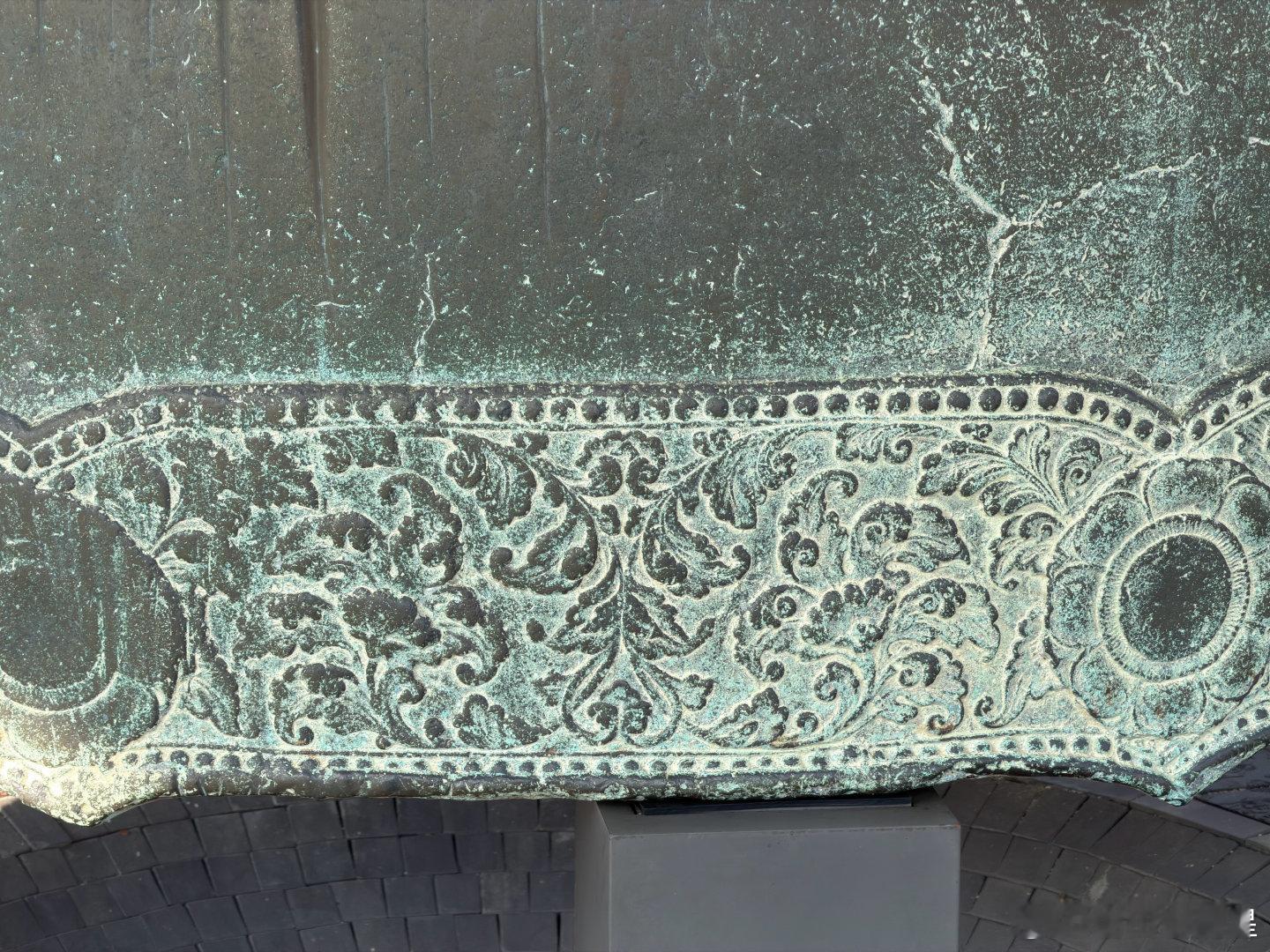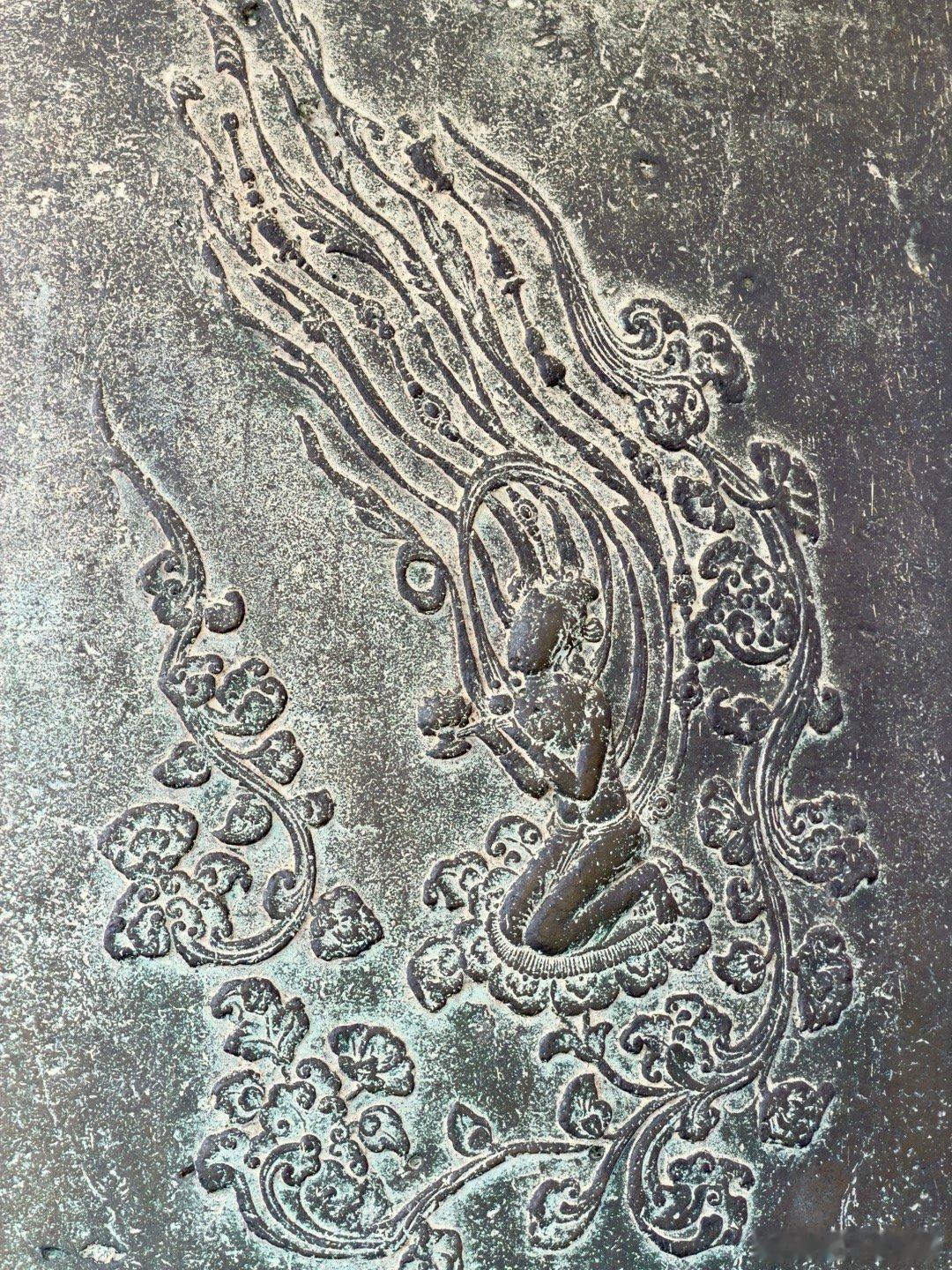 圣德大王神钟,韩国国立庆州博物馆。韩国有没有相当于我国195禁止出境文物级别的至宝呢?那肯定是有的,庆州的圣德大王神钟就是个典型。这个钟是统一新罗时代景德王为纪念其父圣德王下令铸造的佛钟,由惠恭王于唐代宗大历六年岁次辛酉十二月十四日(772年1月)完成。钟通高3.66米,重约18.9吨,号称用铜12万斤。钟身刻有莲花纹、飞天仙女像及1037字铭文。这个钟无论是尺寸、纹饰还是资料价值,都是8世纪东亚第一等的作品。对比一下西安的禁止出境文物景云钟,其铸造于唐睿宗景云二年(711),高2.47米,重6吨,有铭文292字,就可以知道圣德大王神钟确实是非同凡品。当然了,唐代肯定有更大的钟,但没留下来。目前亚洲最大的8世纪铜钟是日本奈良东大寺的梵钟,高3.86米,重26.3吨。这个钟在750年铸造半年后失败,752年用了三个月铸成,在东大寺大佛开眼会前一天才挂好。有可能是工期太紧,纹饰和钟铭都省略了,在艺术性上比景云钟和圣德大王神钟要差很远。宝物亲见,合影留念