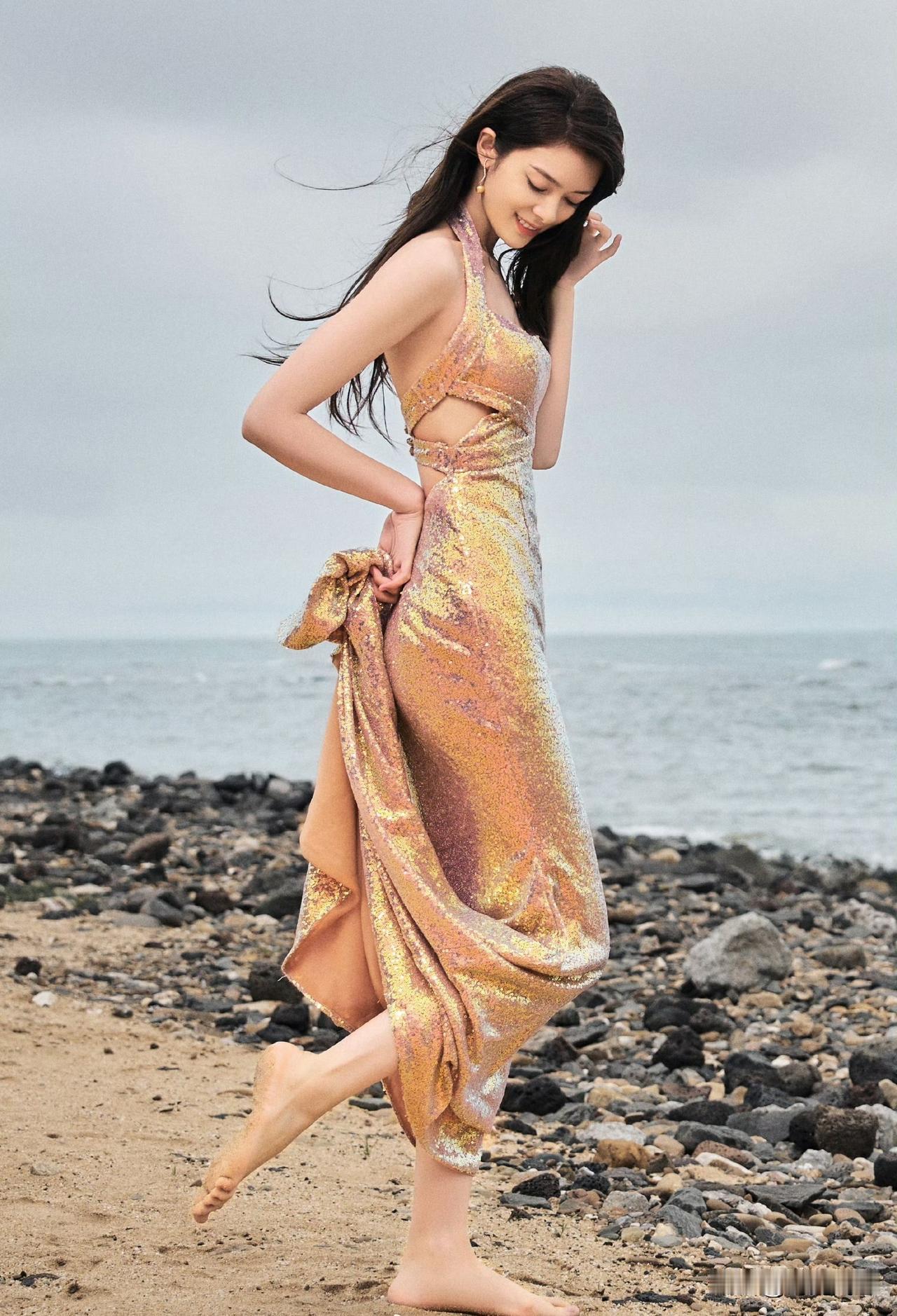 照片中光着脚丫在沙滩上愉悦跑跳的颜值绝美身材高挑曼妙的女神级演员大家认识吗?她是