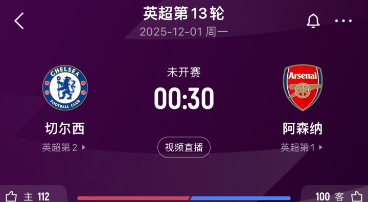 直播吧11月24日讯英超第12轮,阿森纳笑傲北伦敦德比,4-1战胜热刺。切尔西本轮客场2-0战胜伯恩利升至第2。下轮联赛双方将直接对话,切尔西能否缩小与榜首差距?