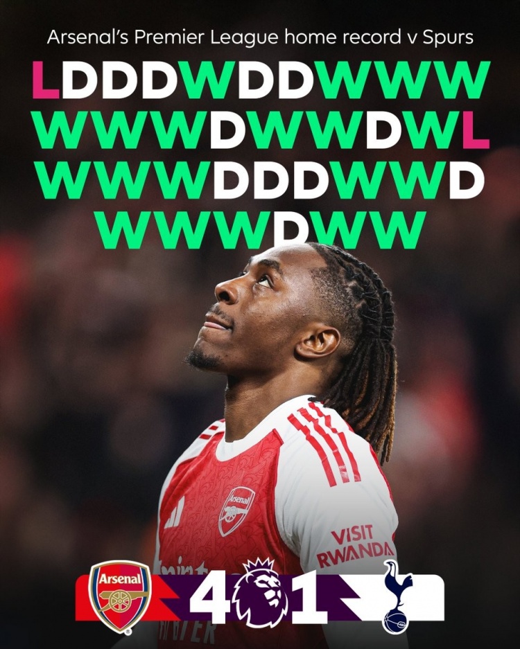 直播吧11月24日讯阿森纳在本轮英超焦点战4-1击败热刺,延续了他们主场联赛面对热刺的强势战绩。