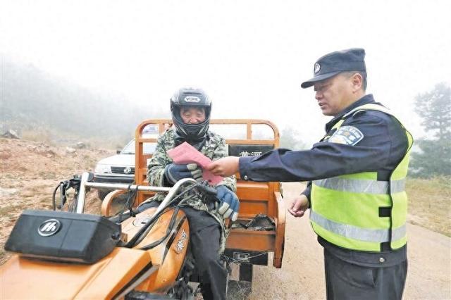 民警对过往车辆进行道路交通安全知识宣传。刘芳摄
