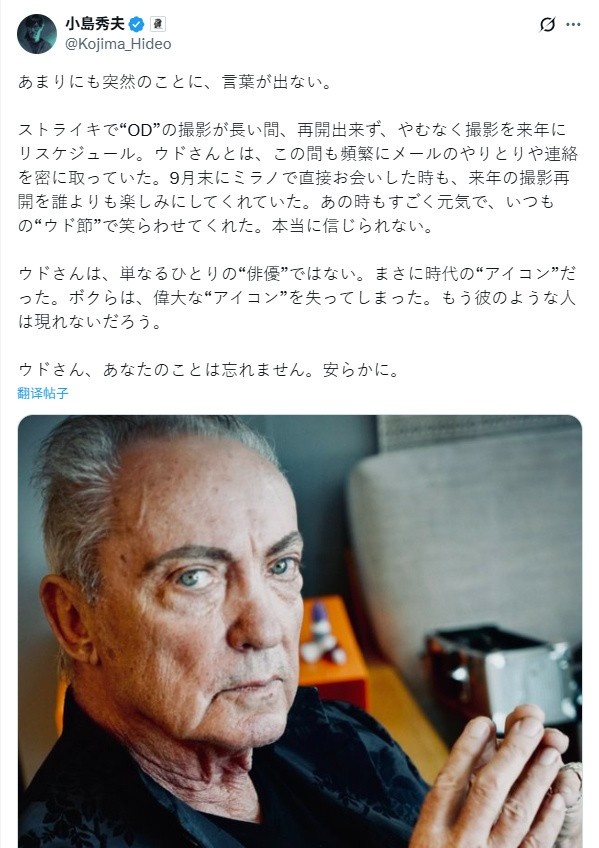因为罢工,“OD”的拍摄在很长一段时间无法重启,不得不推迟到明年。在此期间,我与乌多先生始终保持联系。今年九月底在米兰见面时,他比任何人都更期待来年的拍摄。那时的他精神很好,还用他一贯的“乌多式幽默”逗我们大笑。我真的无法相信。