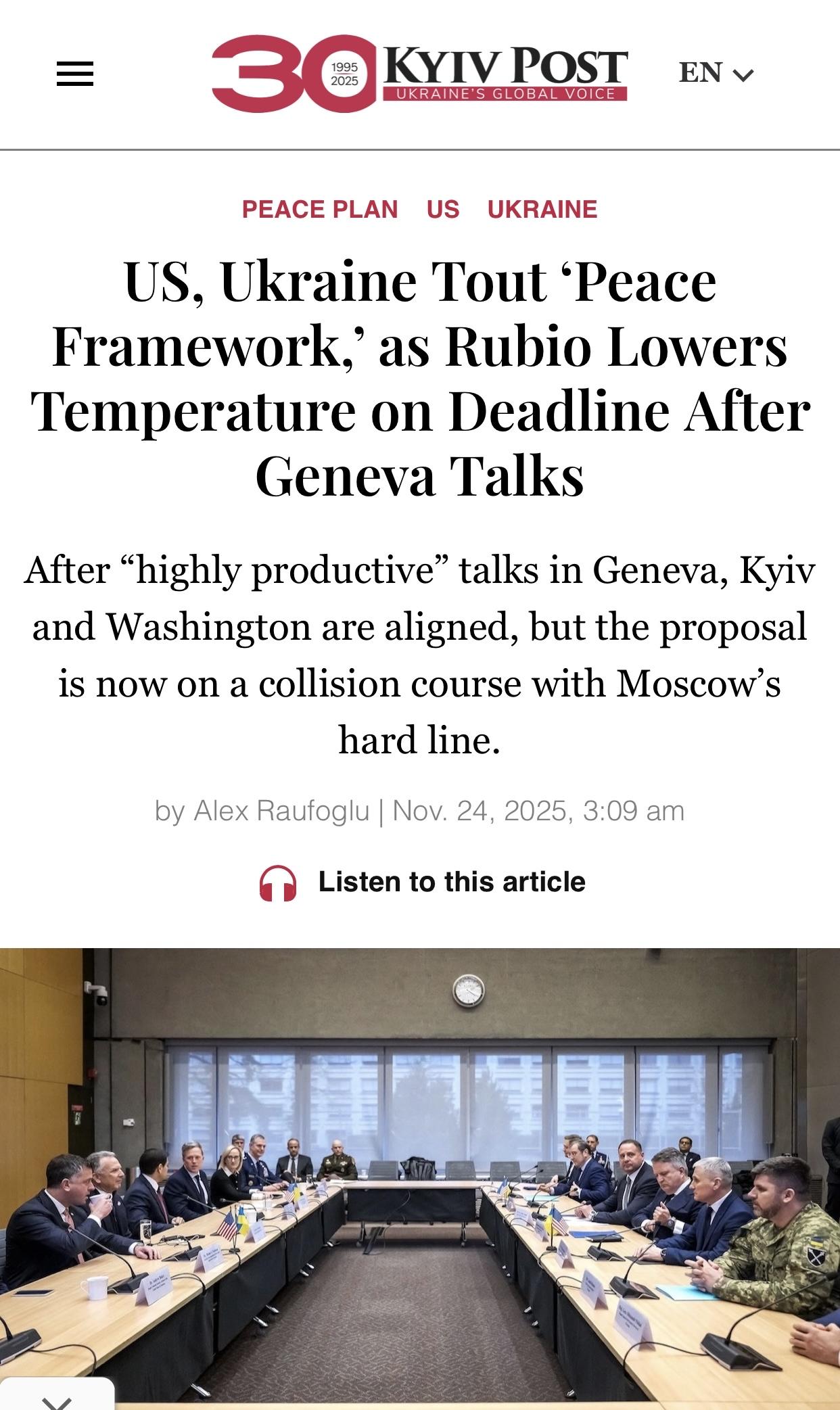 乌媒:美乌又草拟了一份新的”和平计划”,命运如何未知 乌克兰《基辅邮报》官网11月24日华盛顿报道:在日内瓦进行了漫长而疯狂的24小时紧张谈判后,美国和乌克兰于周日晚上联合宣布,他们已就新的“和平框架”的轮廓达成一致。白宫表示,这一框架将“完全维护”乌克兰的主权,并可以构成未来解决方案的支柱,以结束俄罗斯近四年的入侵。 如果该声明预示着一种趋势,但国务卿鲁比奥在美国代表团的新闻攻势表明了一个更复杂的现实:进展,是的,甚至是戏剧性的进展,但远未达到终点。而且,至关重要的是,不再把感恩节列为最后的期限。鲁比奥反复强调这一点——“我们需要更多时间”——对于早些时候将本周四视为软性最后通牒的美国政府来说,这是一个显著的转变:把框架转为向俄罗斯提交草案的阶段。 报道说,在与记者交谈数小时后,美国官员向《基辅邮报》证实,鲁比奥已离开日内瓦,正在返回华盛顿的途中,这实际上暂停了这一阶段的谈判。 报道说,白宫周日发布的联合声明简短、谨慎,措辞明确,以避免吓到任何一方。声明称,美国和乌克兰谈判代表进行了“富有成效”的讨论,并一致认为,任何最终解决方案都必须“充分尊重乌克兰的主权”,并产生“公正、持久的和平”(The joint statement released by the White House on Sunday – brief, cautious, and clearly crafted to avoid spooking any party – said US and Ukrainian negotiators had achieved “highly productive” discussions and agreed that any eventual settlement must “fully respect Ukraine’s sovereignty” and produce a “just, lasting peace.”)。 报道说,声明称,双方已起草了一份最新的“和平框架”(have drafted an updated “peace framework”),并将在未来几天完成“关于联合提案的密集工作”。 报道说,在电讯(Telegram)平台上,泽连斯基称当天的结果是“表明特朗普总统的团队正在倾听我们的声音”,这与最近几周相比,基辅对美国让步的担忧,已经有了明显的改善。 报道说,鲁比奥以他的团队明确确定的路线开始了他的新闻攻势:“今天可能是我们在处理这些问题的整个十个月里最富有成效的一天”。但当记者就细节向他施压时,例如剩余的棘手问题、红线、对任何一方的潜在让步等,这位美国最高外交官一再回避,称这些问题“微妙”、“不断演变”。 他的最主要的信息是:本周四不会是截止日期。他说:“我们希望是周四,无论是周四、周五、周三、下周的周一——我们希望它尽快......但我们需要更多的时间”(“We’d love it to be Thursday,” Rubio said. “Whether it’s Thursday, Friday, Wednesday, Monday of the following week – we want it to be soon… but we need a little more time.”)。 报道说,鲁比奥强调,仍未解决的问题“并非不可逾越”,但他谈及了“语义”、“语言”(指协议中的内容如何表述—译者注)和“需要更高层次决策的条款”等。但更重要的是,他承认,即使美国和乌克兰最终确定了框架中有关各方的条款,但真正的博弈还在前面:让俄罗斯同意。“俄罗斯人有投票权”,他直截了当地说,“无论我们想出什么,都必须交给他们。他们必须同意它才能发挥作用”。 报道说,据美国方面称,乌克兰特使表示,更新后的草案“反映了他们的国家利益”,并提供了“可信和可执行的机制”来防止俄罗斯未来的袭击。 一位了解会议情况的欧洲高级外交官表示,这是“几个月来第一次”乌克兰官员听起来“真正松了一口气”。 报道的原标题是《US, Ukraine Tout ‘Peace Framework,’ as Rubio Lowers Temperature on Deadline After Geneva Talks》(在鲁比奥在日内瓦会谈后对最后期限降温之际,美国乌克兰夸赞”和平框架”)。
