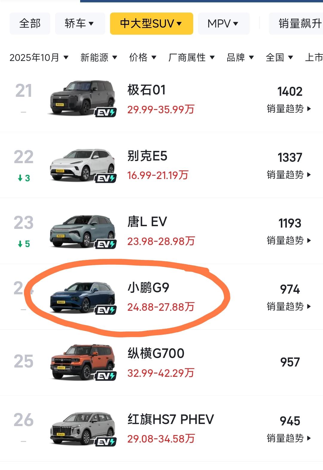 小鹏G9,销量为什么一直起不来? 10月份,小鹏G9卖了971辆,销量不如别克E5和极石01这样的冷门车型。从今年5月份的3590辆,销量一直在下滑,看不到止跌的希望。 作为小鹏汽车的旗舰SUV,G9要颜值有颜值,要配置有配置,24.88万~27.88万的价格,也合情合理,销量为何如此萎靡? 同级别的小米YU7,售价25.35万~32.99万,上个月卖了33662辆,论性价比,远不如小鹏G9,同是新势力,同样是互联网公司造车,小米YU7卖疯了,小鹏G9还在谷底沉沦。 到底是哪里出了问题,小鹏汽车该找找原因了。 实在不行,降价吧,降5万,19.88万,月销量应该能超小米YU7,成为销冠。