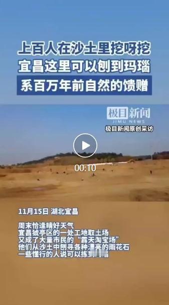 11 月 15 日湖北宜昌晴好,猇亭区一处工地取土场成了市民 “露天淘宝场”,上百人拎着铲子、筛子扎堆刨土,专找漂亮雨花石,懂行的人说这儿能捡到玛瑙,甚至有 “宜昌红宝” 之称的猇红玉髓。 猇亭本就是长江古河道,百万年前岩浆冷却形成的硅质岩,经江水冲刷沉积地下,工地施工正好把这些石头翻了出来。现场男女老少蹲满沙土堆,有人举着洗净的石头比花纹,有人传言品相好的能卖钱,连外地爱好者都特意赶来。 不过热闹背后藏着险:工地有深坑、松动土坡,还有挖掘机来回作业,随时可能塌方。当地部门已拉警戒线劝离,提醒大家工地不是景点,再值钱的石头也比不上安全重要,真喜欢奇石不如去正规花鸟市场挑选。