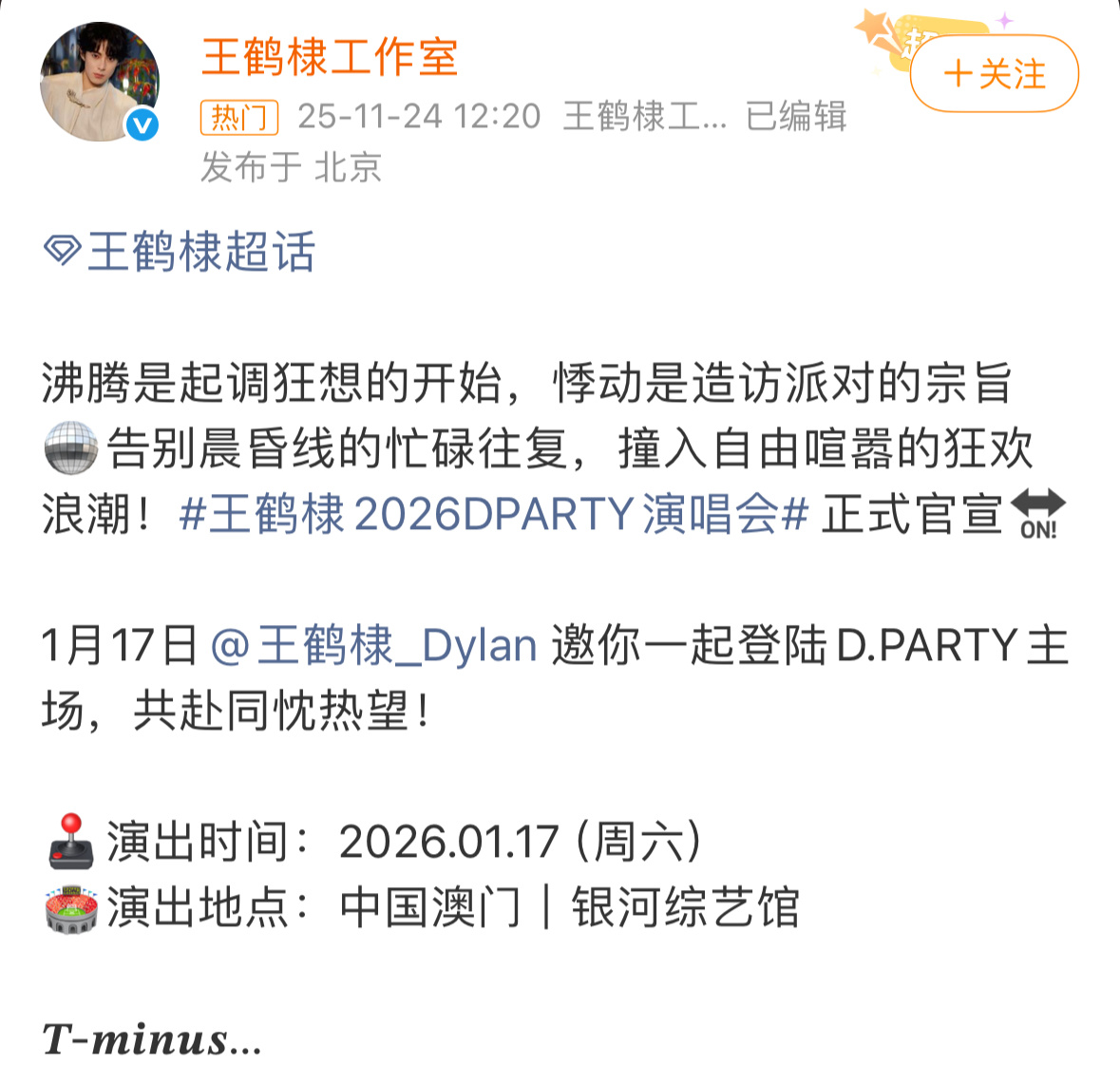 王鹤棣2026DParty演唱会正式官宣!1月17日澳门银河综艺馆与歌手棣棣不见不散!