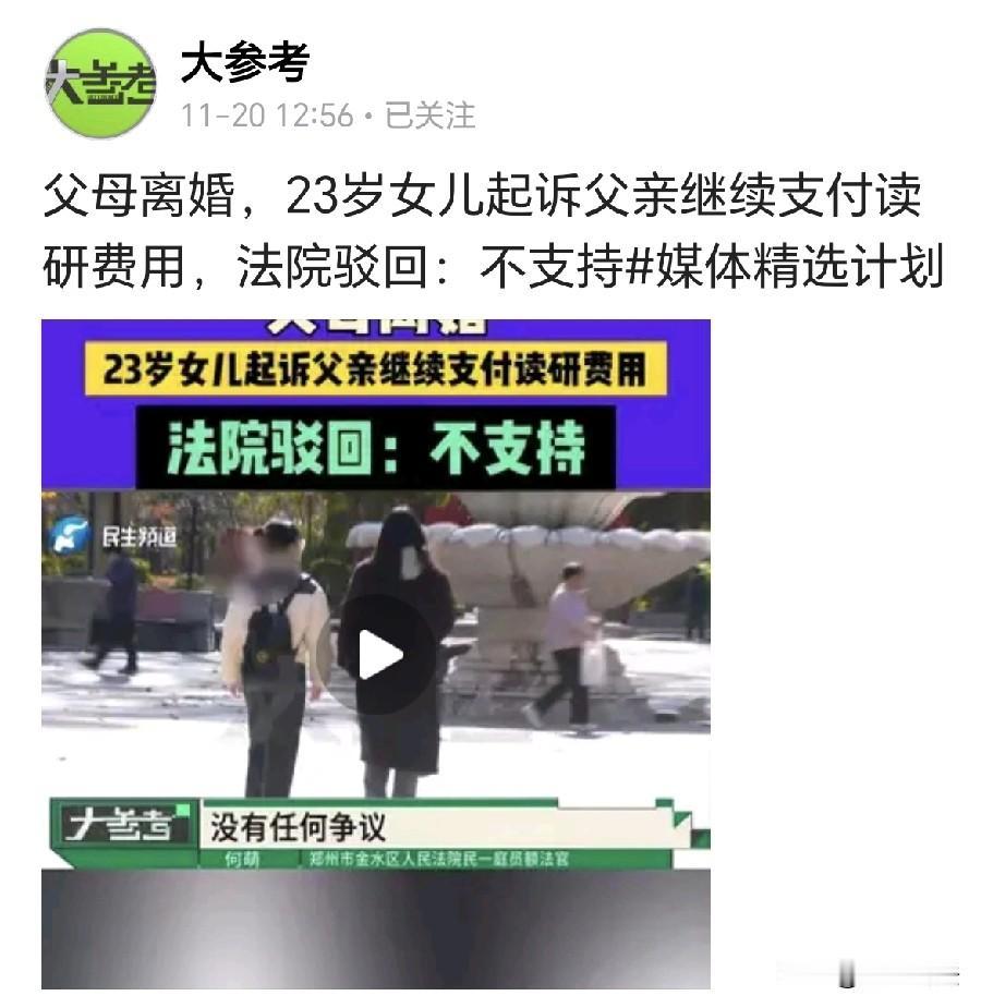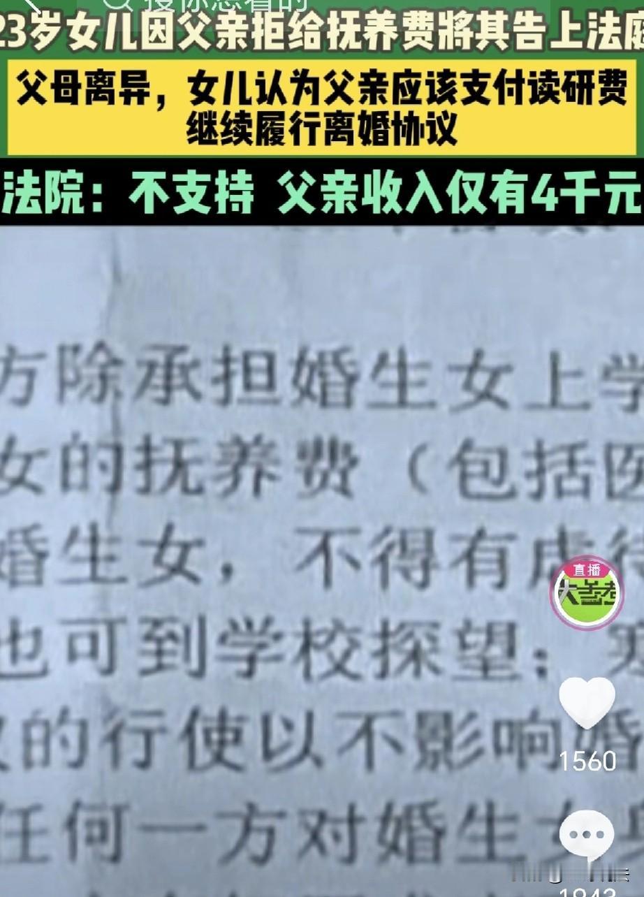 贪得无厌!河南郑州,一女子18岁时,父母离婚,女子和母亲生活,父亲承诺,承担她大学学费,另外再给她每月2000元生活费,大学期间,父亲恪守承诺,按时支付各种费用,女孩顺利毕业,又去考研,父亲又支付了一年,第二年时,父亲不给了,说他年老体衰,每月工资只有4000元,他得为自己的养老做准备了,女子不愿意了,一纸诉状告到法院,要求父亲继续支付她学费生活费,法院判了! 另外,父亲再每个月给她2000块生活费用, 刚满18岁的小琳正忙着备战高考,家里却传来了父母要离婚的消息。 对于小琳来说,家庭破碎的打击不言而喻,但父母签订了协议,协议里写得明明白白:小琳跟着妈妈生活,爸爸负责她的大学学费和生活费。 另外,父亲再每个月给她2000块生活费用,父亲的承诺,才让小琳安下心来,虽然父母分开生活,但是双方已经对她没有改变。 不久之后,小琳顺利大学,父亲十分高兴,女儿优秀,给他争光,父亲按照离婚时的承诺,把大学学费交给了小琳。 之后,父亲兑现了承诺,每到收费的时候,学费都会准时打到她卡上。 每月到了时间,2000块生活费从不拖延,小琳的生活从未感到过拮据,父母的爱一直滋养着她努力的学习。 本科四年,父女俩的联系也不算频繁,关系也因为父母离婚有些疏远,但是在费用的问题上从没起过争执,小琳心满意足,依靠父亲的支持,她顺利读完了大学的课程。 转眼间小琳大学毕业,拿着毕业证的时候,她满心的感激,父亲为自己付出了很多,等自己找到工作,一定会要回报父亲。 谁知如今的学历,本科已经不算什么,小琳思前想后,她打算继续深造,于是,她报考了研究生的考试。 经过一番努力,小琳凭着优异的成绩,如愿考上了硕士研究生,她告诉了父亲,父亲一开始也挺开心。 女儿学历又高了一个档次,作为父亲,他也是满心的欢喜,可是他又有些顾虑,自己年纪已经大了,体力已经大不如从前。 父亲原本以为,自己艰苦几年,供女儿读书出来,等到她找到工作,能够独立生活,他就能休息休息,养一养这即将衰老的身体。 谁知女儿选择了考研,学完之后,又要几年,他暗自流泪,他有些精疲力尽,不知道这样的生活何时才是尽头。 女儿读研的第一年,他还是按时给了学费和生活费,他勒紧了自己的裤带,终于供小琳读完了第一年。 第二年的时候,父亲思前想后,他已经老了,得为自己的后半辈子做个打算。 女儿大学期间,他已经遵守了承诺,每个学期按时给女儿缴纳学费,每个月也按时给她生活费。 如今女儿早就成年,她也已经23岁,这个年龄,完全可以自己独立,她可以去找兼职,供自己的学业,不能就这样无休止的问自己要钱。 于是,到了小琳第二年读研的时候,他坚持毅然拒绝再次给小琳学费和生活费。 小琳不乐意了,研究生每年学费生活费大概10000元,这对她和母亲来说,是一笔较大的开支,并且,她已经习惯父亲多年来的付出。 同龄的孩子都开始兼职挣钱,有的帮人代课,有的去给小学生做家教老师。 再不济的周末周日,会去超市坐坐兼职,总之做什么工作的都有,有的长期,有的短工。 其他孩子觉得,自己给自己赚生活费了,这样还能体验生活,增加阅历。 可小琳不这么认为,她认为父亲应该继续供她读书深造,她不觉得自己已经长大成年,她觉得自己依旧是父母的宝宝。 小琳立刻给父亲打电话质问,父亲给她解释,不是他不想再给,是他真的没有能力了。 他的年纪已经大了,许多的病痛也都随之而来,他的身体大不如前,他没那么多的钱了,他要为自己的老年考虑。 父亲还说,女儿已经23岁,已是成年人了,早就具备了独立生活能力,也已经超过了法定抚养的范围。 因此父亲决定,从此后不再支付女儿的生活费和学费。 小琳和他理论,各种的沟通,但是,父亲已经下定了决心,他不给了,孩子终归是要长大,不能再依靠他了。 可小琳没法接受,她一纸诉状告到了法院,要求父亲继续履行离婚协议里的约定,支付她读研期间的学费和每月2000块生活费。 法律点一:成年子女读研期间是否属于父母法定抚养范围 《最高院关于适用〈民法典〉婚姻家庭编的解释(一)》第41条规定: 不能独立生活的成年子女指尚在校接受高中及其以下学历教育,或丧失、部分丧失劳动能力等非因主观原因无法维持正常生活的成年子女。 小琳23岁,已成年,读研属于自愿深造,并非高中及以下义务教育范畴。 小琳已经具备兼职赚钱能力,并非因客观原因无法独立生活,不符合不能独立生活的成年子女定义。 父亲月入仅4000元,生活已极度拮据,无法定强 制义务继续支付小琳的读研费用。 离婚协议签订时,小琳刚满18岁备战高考,大学学费生活费应结合当时情境合理解释为本科阶段教育支出。 而研究生教育,并非是离婚协议约定的内容,而且父亲经济能力有限。 因此法院判决,驳回小琳的全部诉讼。 关注@王哥说法 多学法律少吃亏!