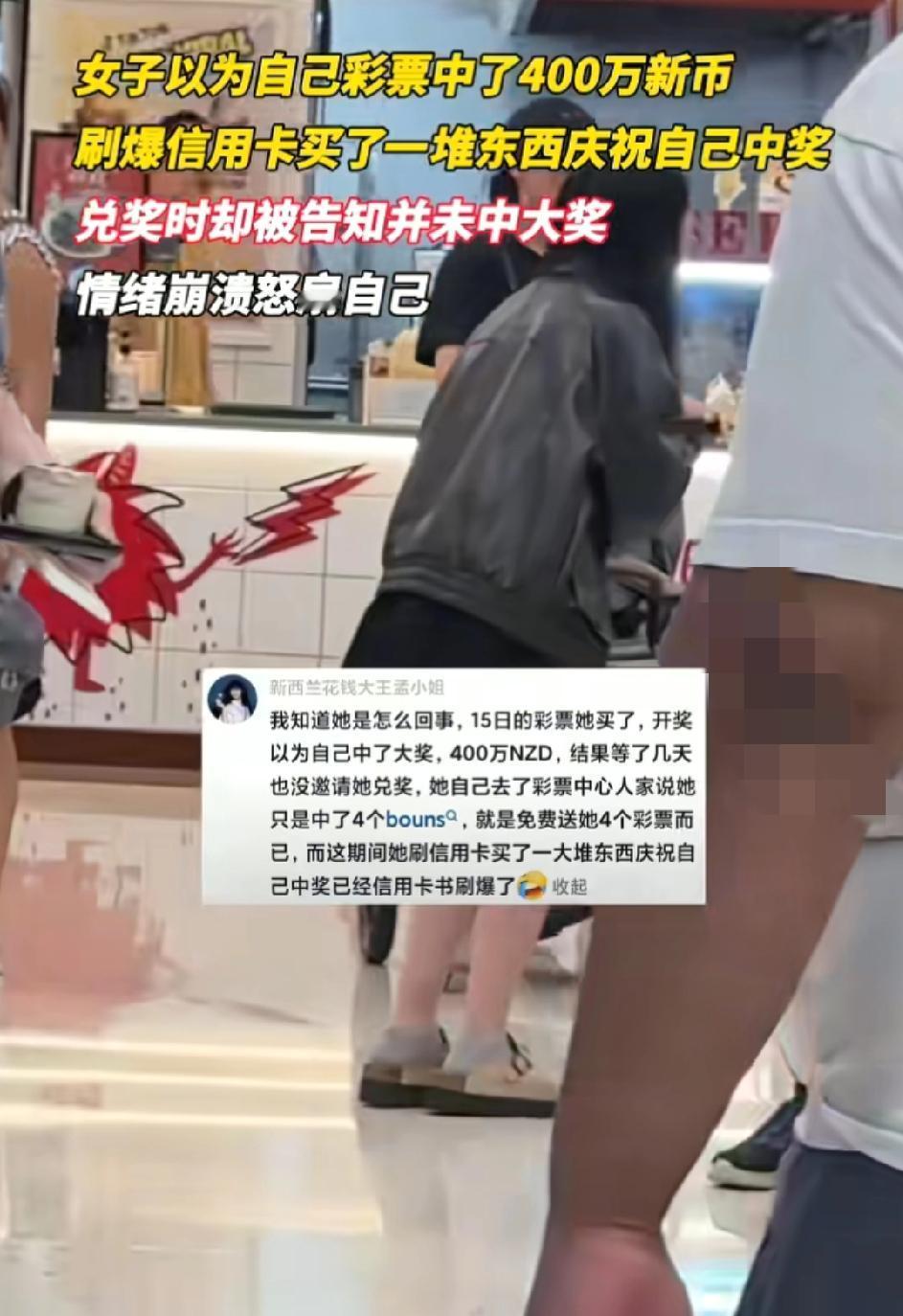 新西兰,一名女子核对彩票号码时误以为自己中了400万新币大奖,结果她提前刷爆信用卡购买大量商品庆祝,没想到的是在兑奖时被确认未中奖。 女子得知没有中奖,当场情绪崩溃,在商场当众扇自己耳光。她不仅没有获得奖金,还背上了大额信用卡债务。 此事引起网友热议,有网友说:“ 还没领钱就疯狂刷卡消费,这种就算是真的中用不了多久也会败光了。” 还有网友说:“只有一个办法,把买的东西打折卖了吧,生活要紧。” 也有网友说:“想起我同事,以为报销下来了,结果请大家喝奶茶。结果赔偿到手6元。” 在还没有确认结果就提前消费,也太夸张了吧!导致这样的后果,也反映出冲动会带来不可预知的风险。 对此你有什么看法?