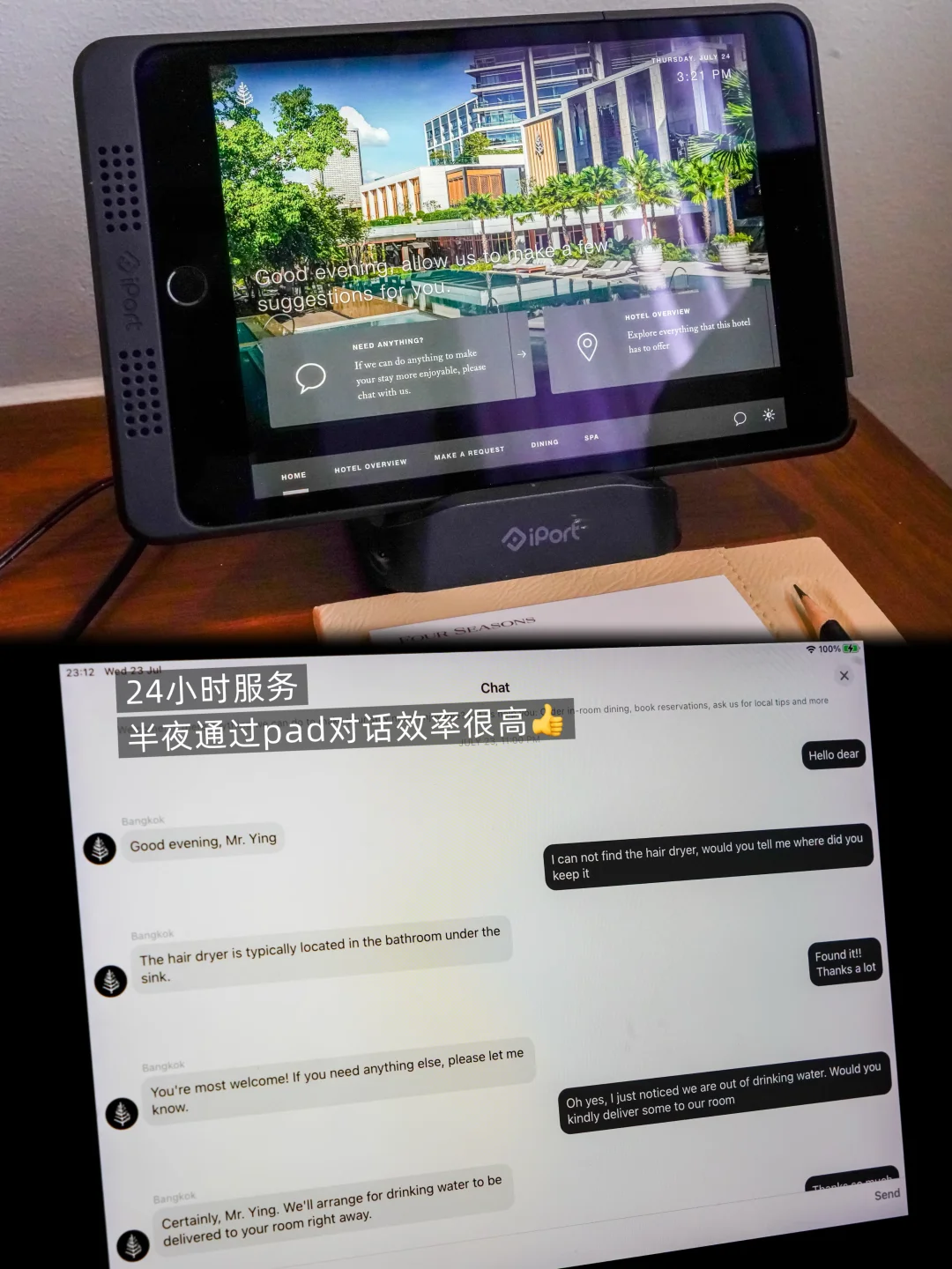 [烟花R]都说是亚洲的旗舰之作,入住后感概,湄南河四季的硬件措施真的是没话说,从大堂、泳池、餐厅再到房间,真的是无可挑剔。大堂内随处可见的艺术装饰品,房内的洗浴用品及床品,无一不让人感到高雅与格调。即使身处曼谷闹市,依然能感受到这是一处静谧的绿洲。 . 🌟24小时服务 房内ipad可以预订及呼唤服务,24小时服务。深夜发现房内饮用水不够了,尝试了ipad呼唤,应对非常及时。10分钟就把水送过来了,足足给了我们6瓶水,够够了。 . 🌟泳池是我最喜欢的地方 一如既往地喜欢每一家酒店的泳池~ 这家的泳池也是真的nice,日落方向。可惜我入住期间都是阴雨天气,日落是看不到一丁点儿~ 泳池旁还有免费防晒取用。 . 🌟餐厅Plamier 用餐环境很棒,我们点的set mune,午餐,挺不错的。很喜欢他们的牛肉塔塔和甜品,我们选择室外用餐,酒店河滨区域也是我很爱逛的一个区域。 . 🌟游船接驳 接驳到对岸的Icon Siam的游船很漂亮,每天都有免费接驳船,无需担心出行不便,可惜我们没有去尝试。 . 说点小遗憾: 1⃣️酒店大门进去会有一段小斜坡,当时我们在大马路的大门下车后,居然没人帮忙拉行李,只能自己拉着行李爬上这小段斜坡。距离大堂门口7-8米左右(我猜?反正差不多门前大树了),门童也并没有迎上来,只有差不多走到门口了(可能3-4米吧,和踏进门口差不多感觉了),门童才过来拉行李,这点让我非常意外。 2⃣️早餐环境很棒,但是感觉品类很少,位置也不是很多。有点疑惑,如果是大旺季,这空间能应对得来吗?服务员点单时候也有点混乱,两个不同的人来重复点餐,我都懵了。 . 🌟Anyway 总体还是满意,也推荐给朋友,有机会会再去。 .