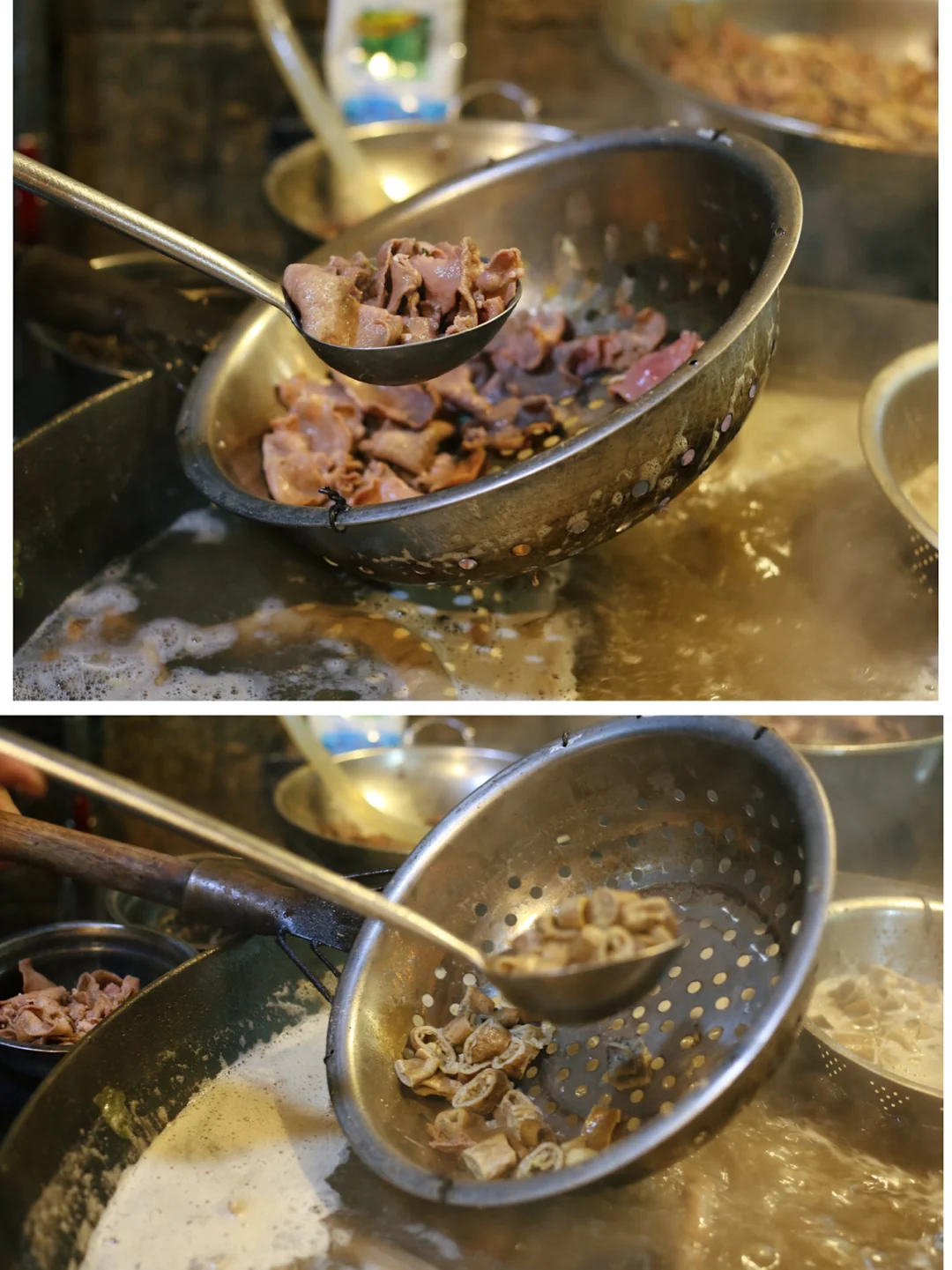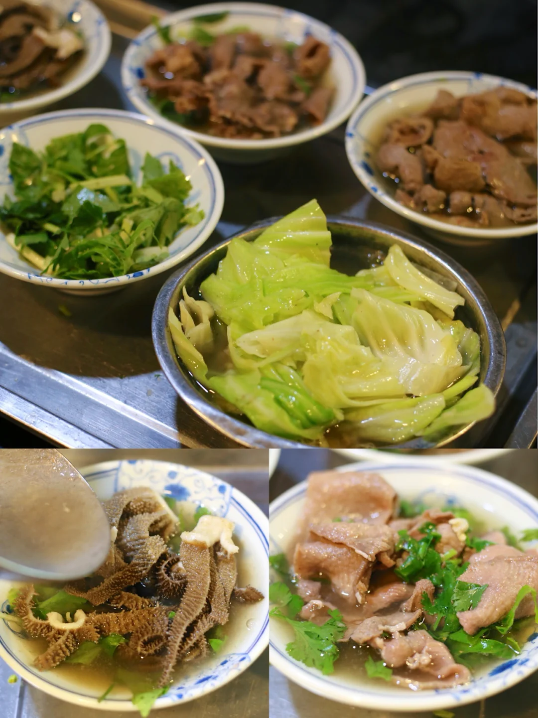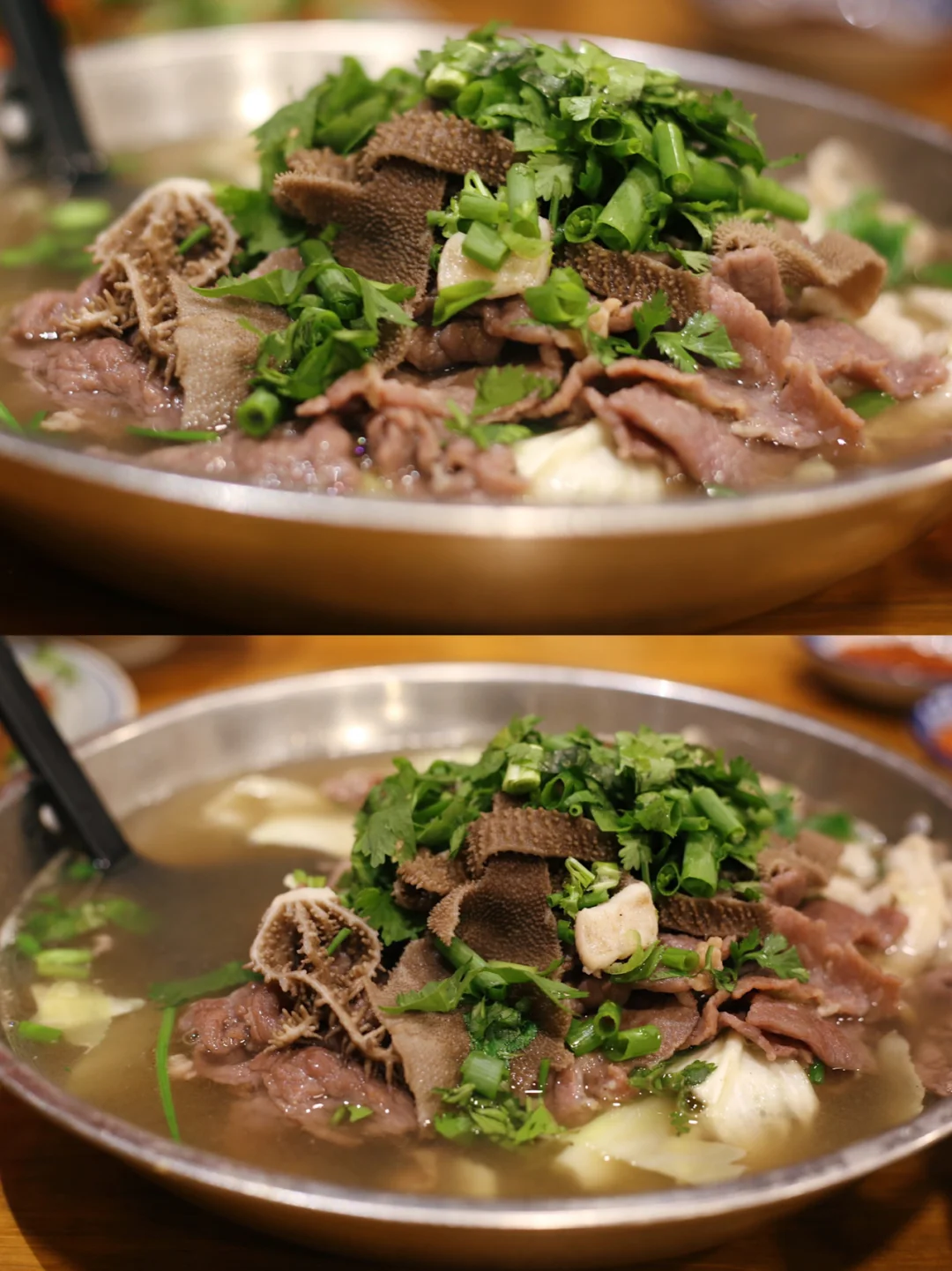 ‼️翘脚牛肉的汤味鲜是关键,一到门口就被厨房的一口大锅吸引过去,里面是牛棒子骨熬制的底汤,里面有十几种佐料,将切好的各类牛肉,牛杂,牛舌等等装在专用的铁篓里,在汤里来回打个滚,装进小碗浇上牛肉汤,撒上香菜就可以上桌了! 哇~看得直流口水
