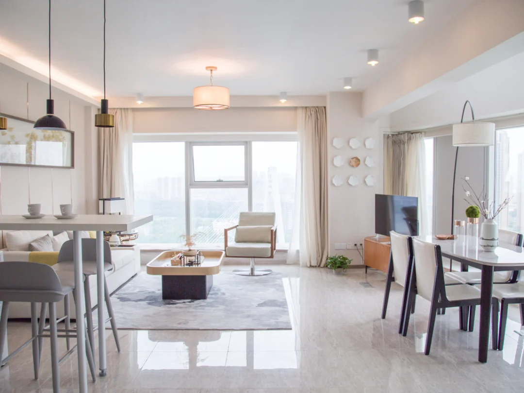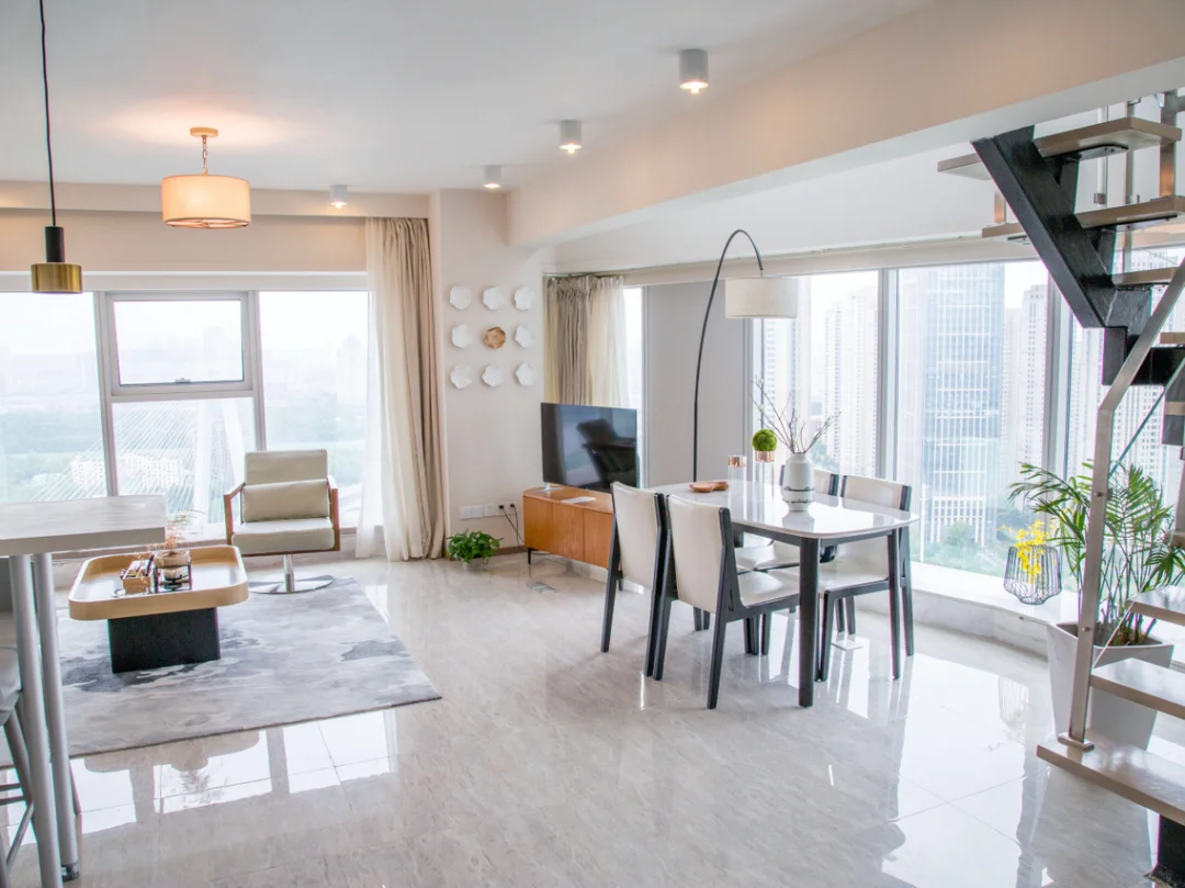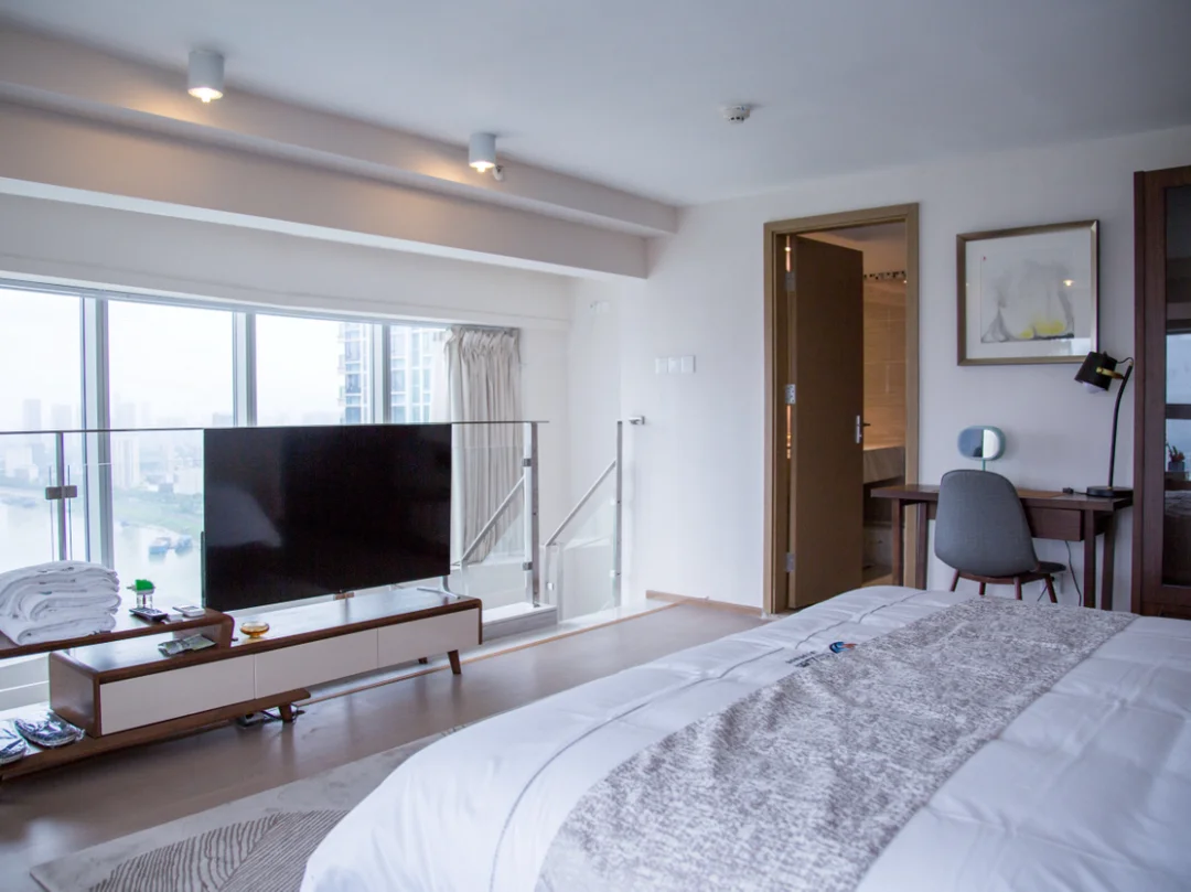 来来回回那么多次武汉,从没住过江边,这次专门在网上挑了一家江边的酒店(悠然服务公寓,名字倒是挺清新脱俗🌹),是一家公寓式酒店,房间为loft户型(其实我就是喜欢这个而已),订的是他们的江汉印象180度行政江景房⛲️888一晚上,面积大概在110平米以上,下层为客厅,平常坐在这里看电视玩手机也挺好的,上层为卧室🏡和洗手间。